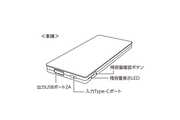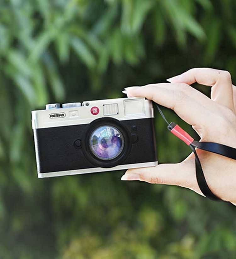 まるでカメラのような、ユニークなデザインのモバイルバッテリーです。