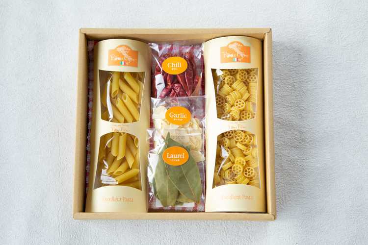 気軽に本格イタリアンを楽しめるパスタのギフトセットであるボーノ!シリーズ。ソースが絡みやすいホイールとペンネのショートパスタとチリ、ガーリック、ローレルなどの3種のスパイスやキッチンタオルが同梱された、贈る人のセンスをさり気なく伝えてくれるナチュラルで可愛らしいギフトです。味はもちろんキッチンを彩るインテリアとしてのルックスも魅力的です。引出物やちょっとしたお手土産にぴったりです。
