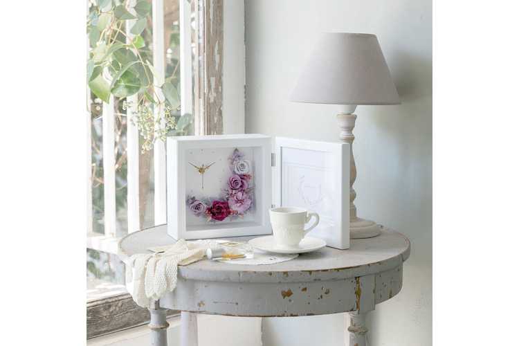 時計もプリザーブドフラワーも、フレームの中に入っているので、普段のお手入れは外側をサッと拭いていただくだけ。