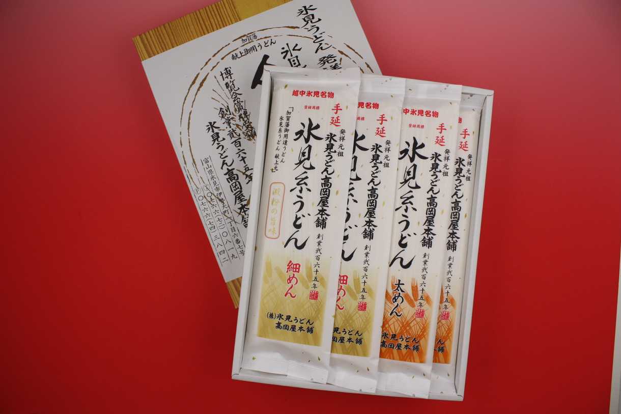発祥、元祖氷見うどん高尾野本舗が創業265年の伝統製法を基に生まれた手延べ氷見うどん三種詰め合わせです。手延べならではのもっちりした弾力の強いコシに滑らかな口当たりが好評です。冷やしても温かくしてもおいしくいただけます。