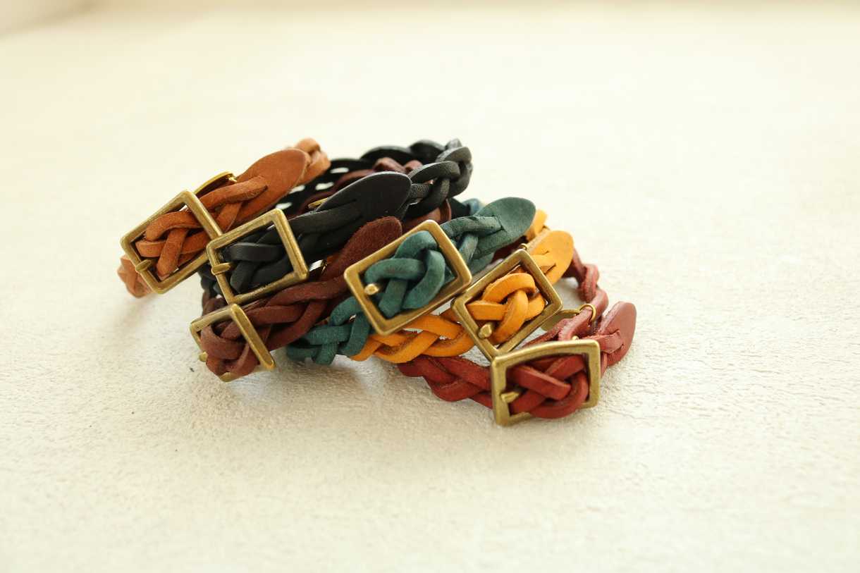 1枚革を不思議なテクニックを使って編み上げたシンプルなブレスレット。