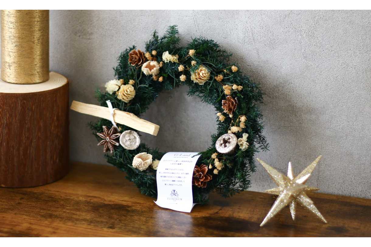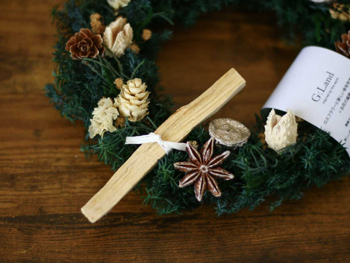 南米で「聖なる木」と呼ばれる神秘の香木「パロサント」をあしらった、神聖な香りも楽しめるクリスマスリース。