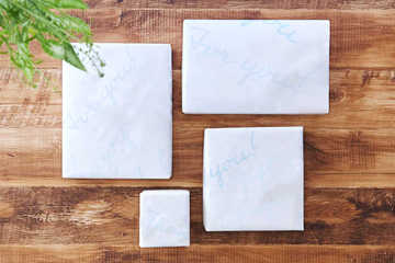 白と青を基調にした上品なデザインのラッピングです。