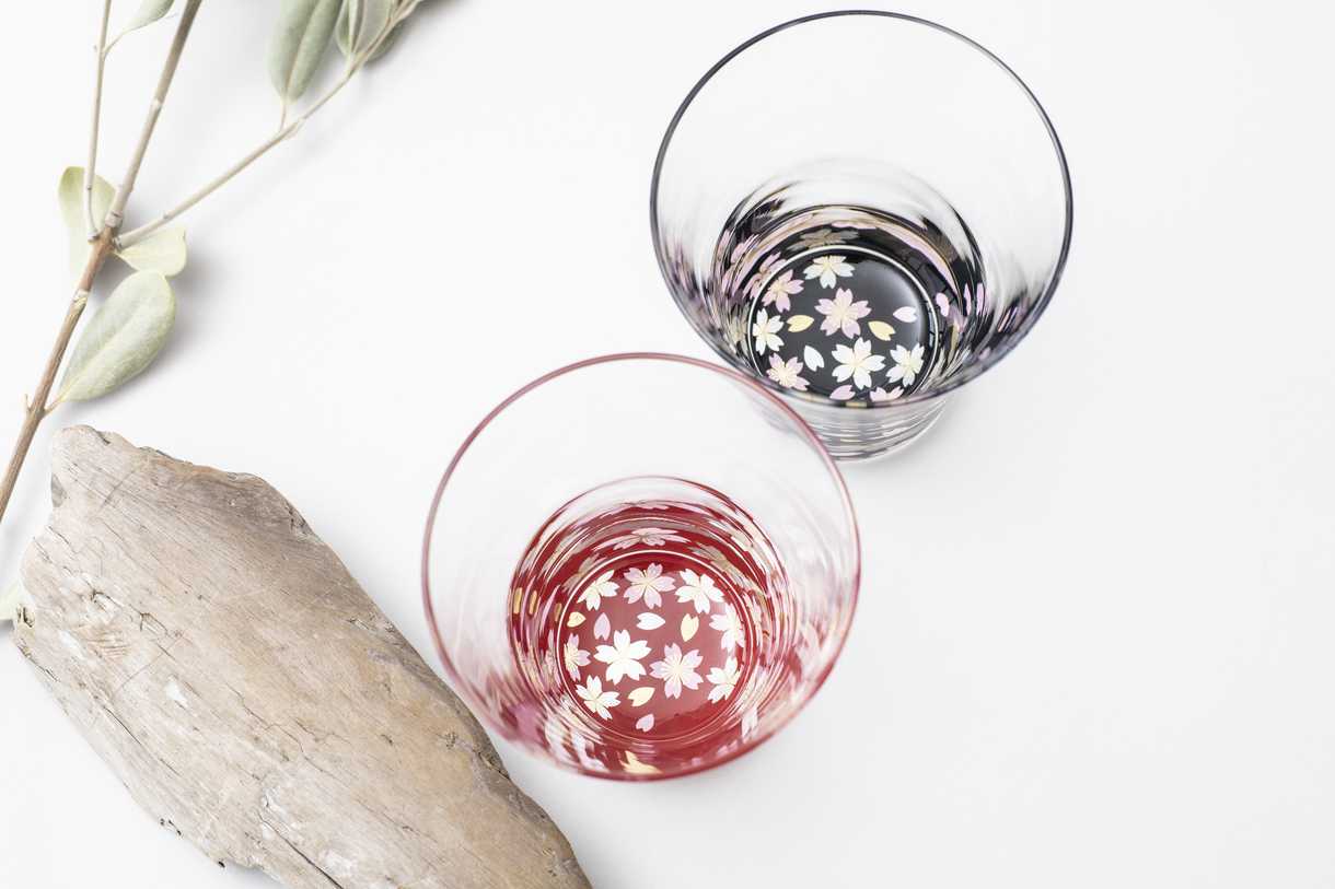 名入れグラスの底面に上品な桜模様をあしらった紀州漆器の一品。