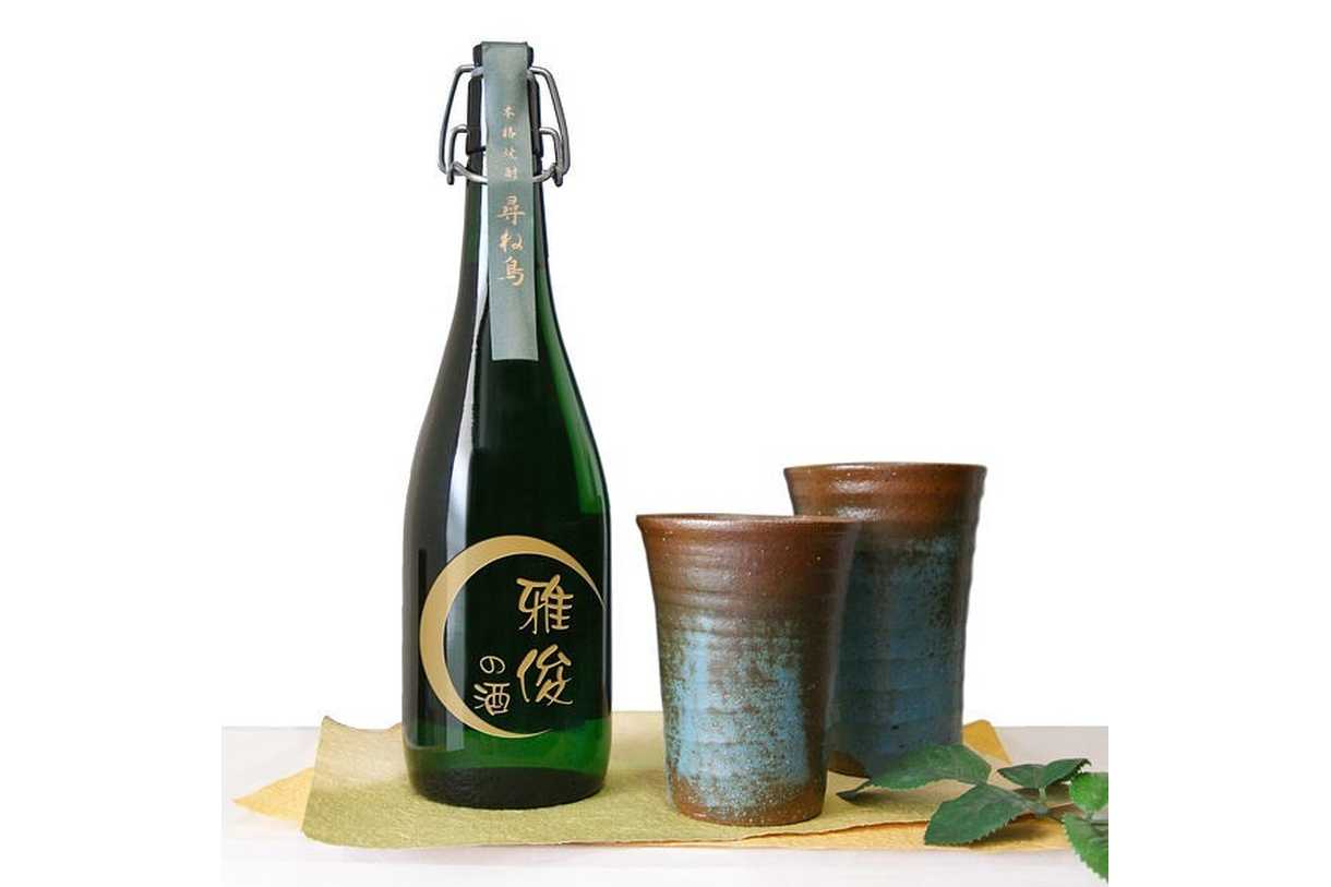 世界で一つの名入れ焼酎ボトルと、趣のある色合いの信楽焼のペアカップのセットです。