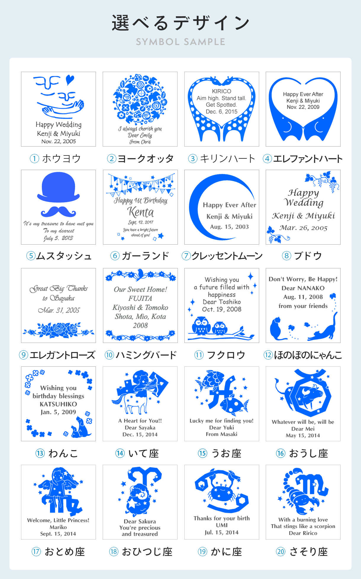 刻印できる文字数はお選び頂くデザイン・文字内容により変わります。スペース内に収まるように全体のバランスをみながら必要な改行をいれさせていただきます。ご了承ください。