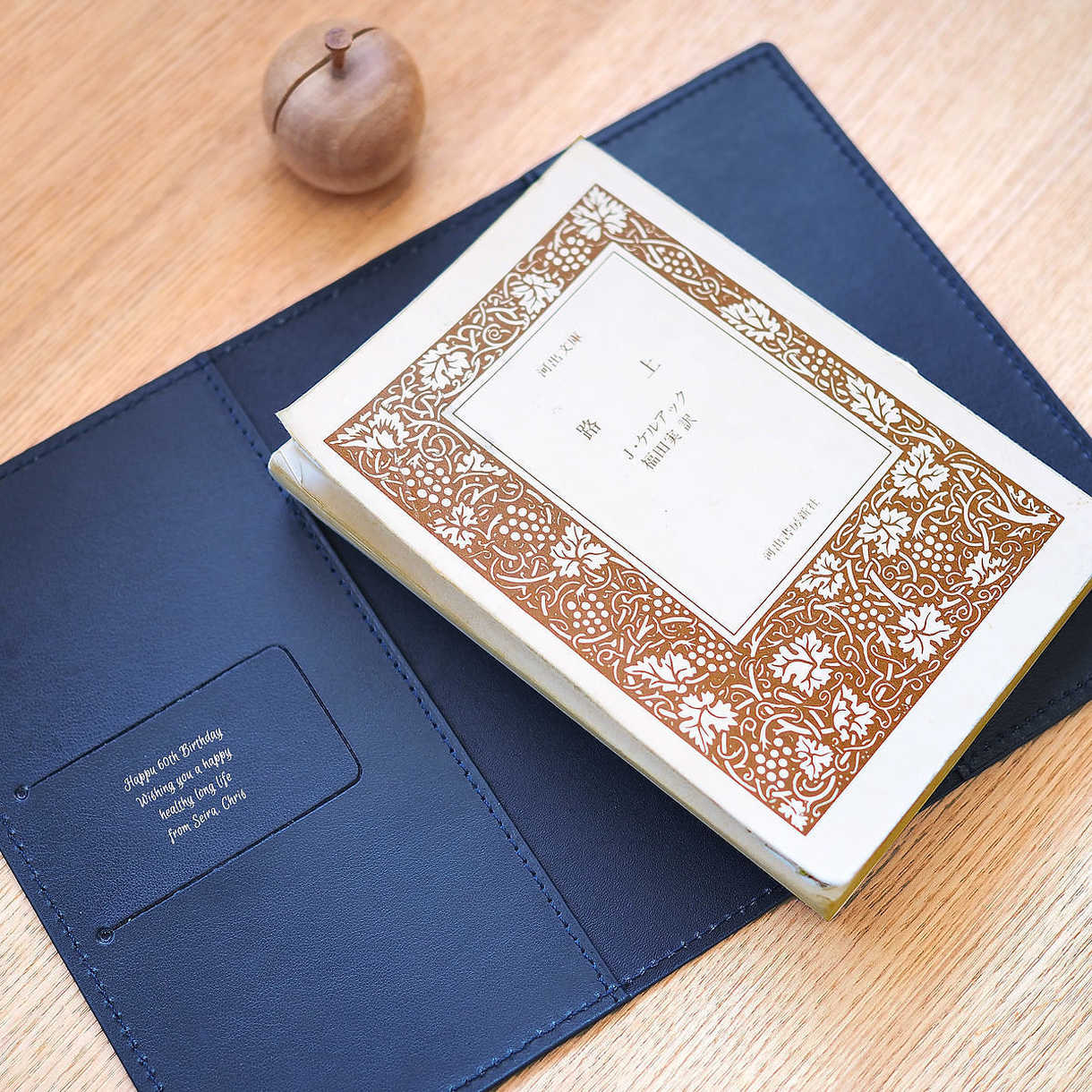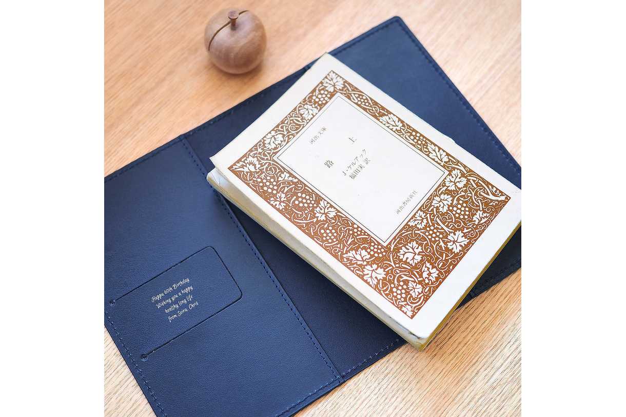 本の型崩れを防ぐ厚みのあるレザーブックカバーです。メッセージが入るタグの部分がしおりになっていて、読みかけのページをすぐに開くことができます。
