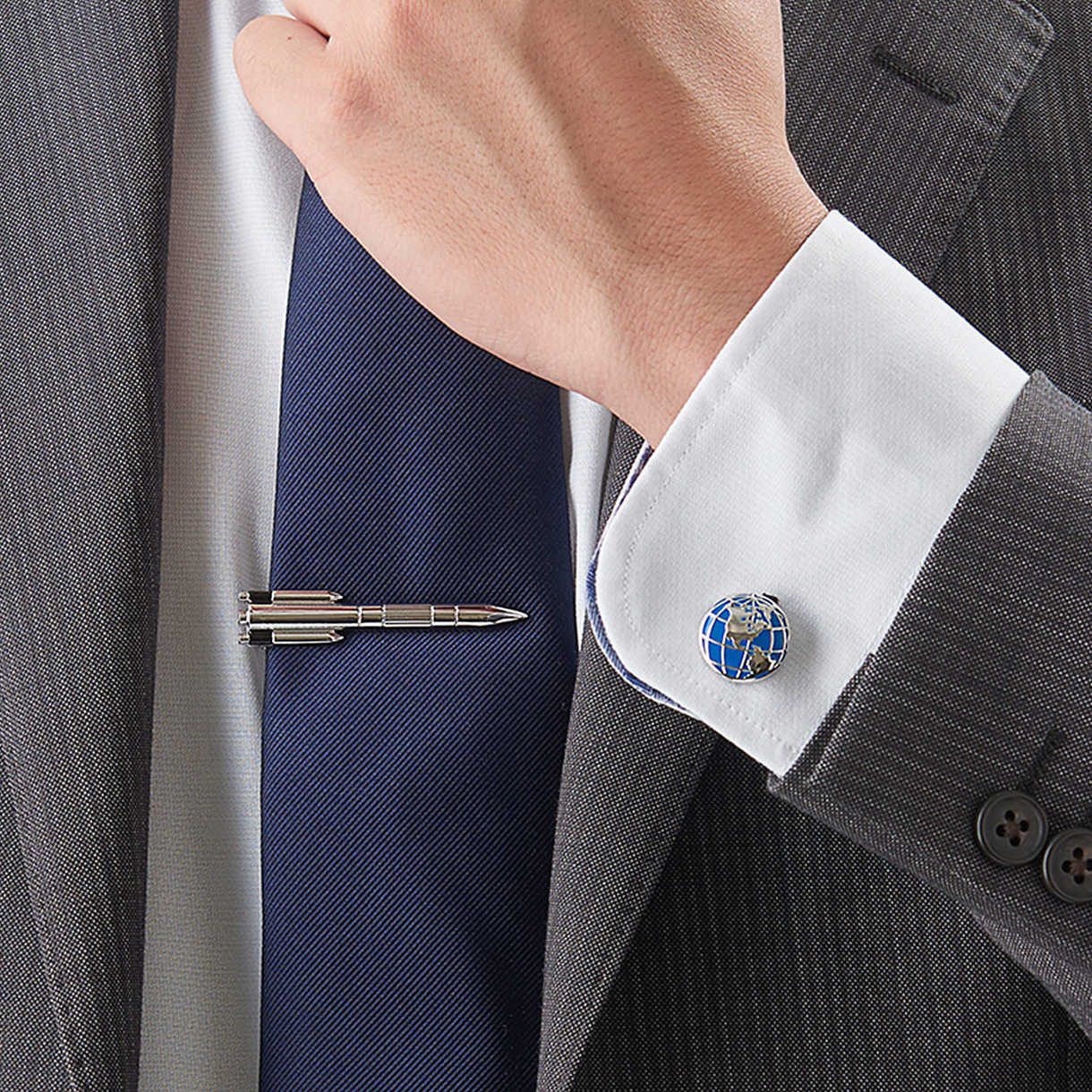 ロケットのネクタイピンと地球儀のカフスボタン。遊び心のあるおしゃれな男性へ。