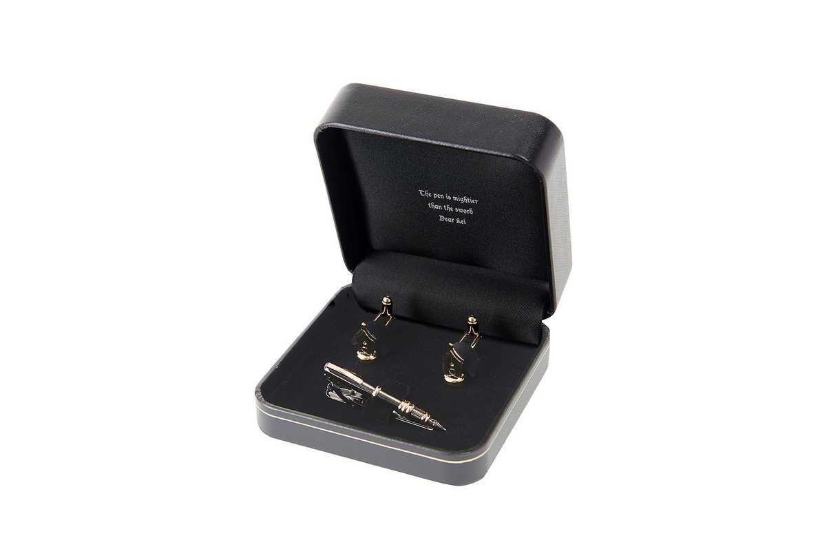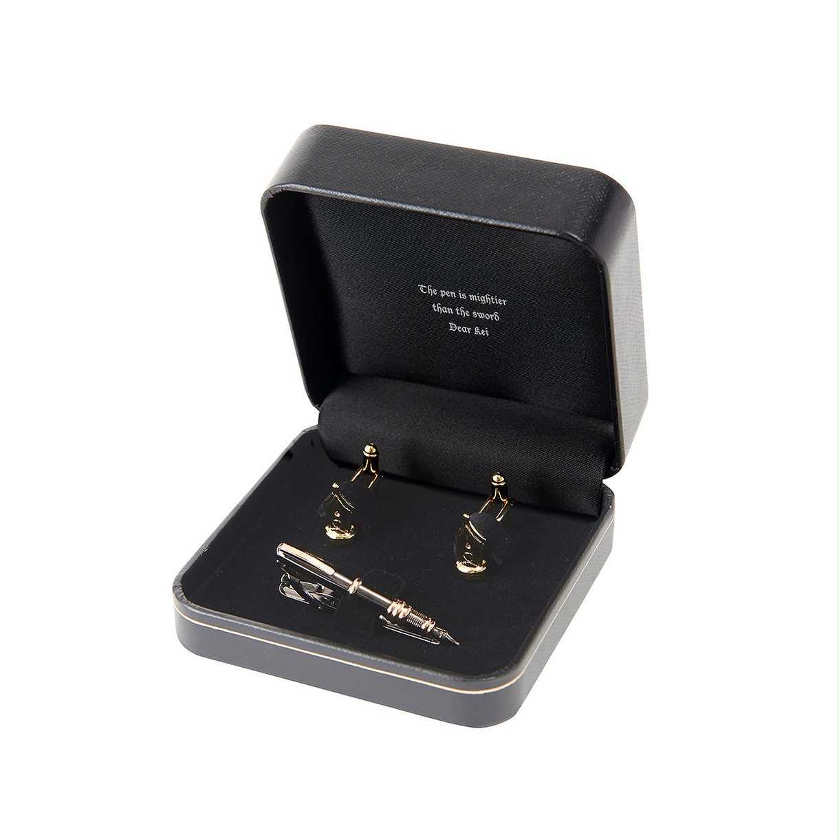 万年筆モチーフのネクタイピンとペン先モチーフのカフスボタン。知的でスマートな男性へ。