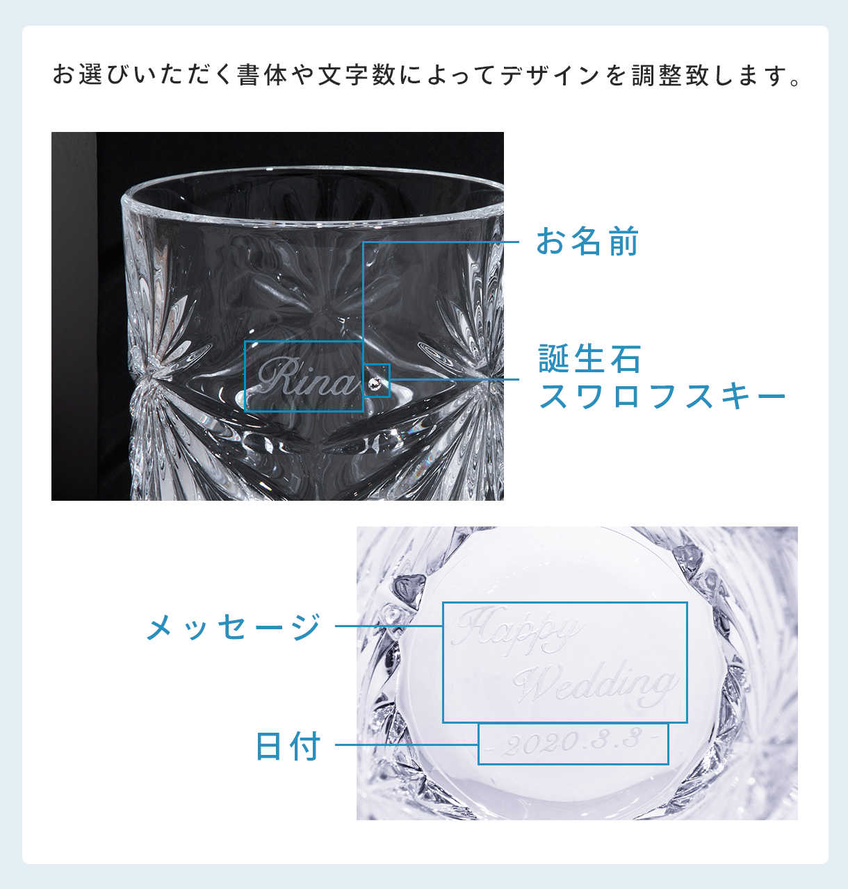 こちらのグラスに刻印する文字のフォントは、お選びいただけます。