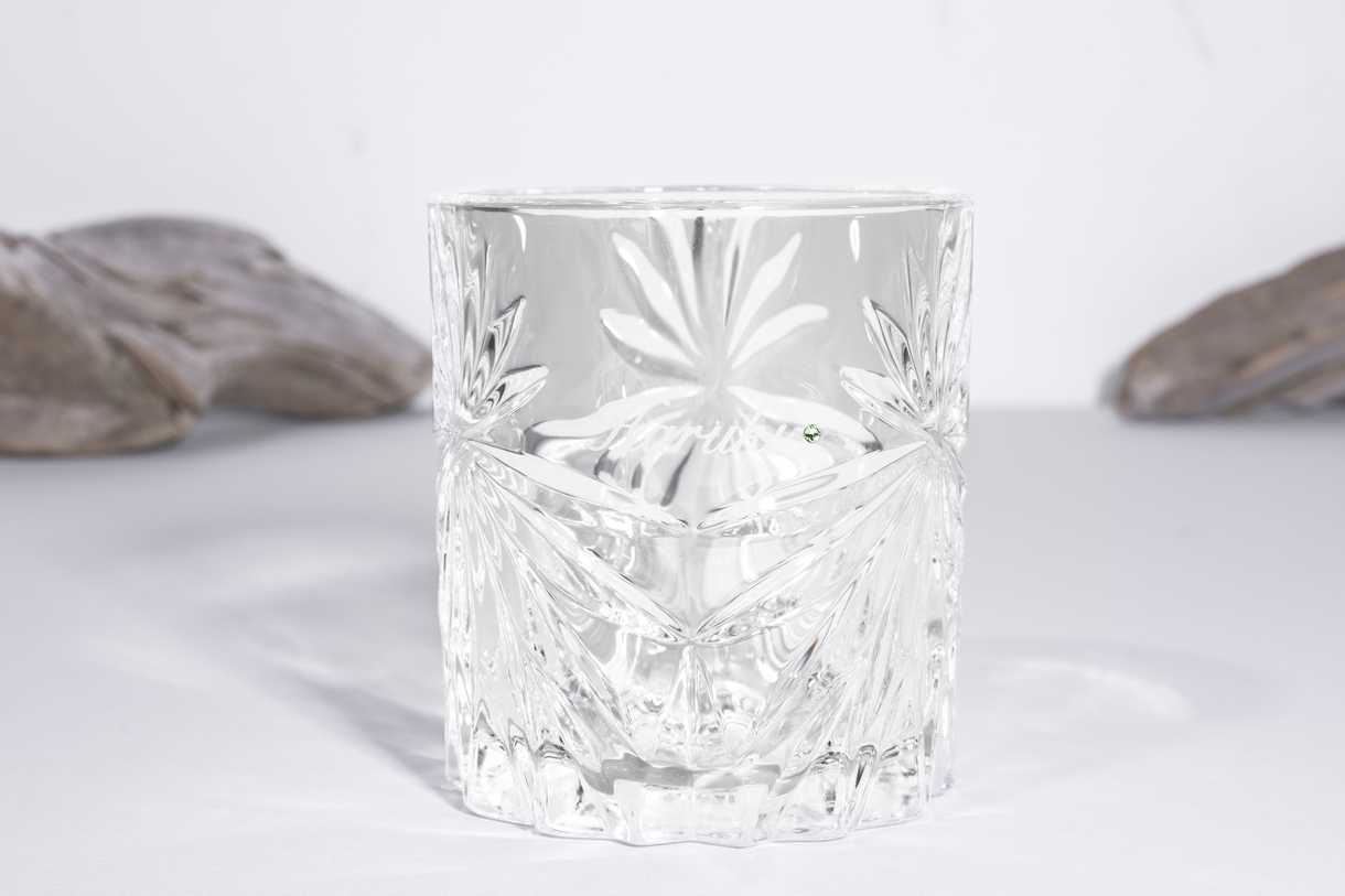 重量感のあるクリスタルのロックグラス。誕生石を付ければ、さらに特別な一品に。