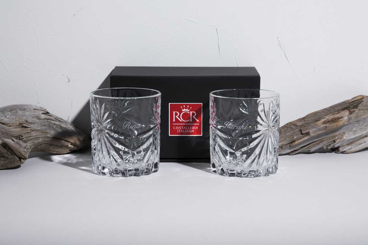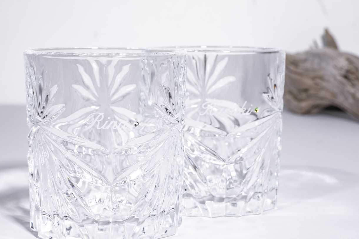 重量感のあるクリスタルのペアロックグラス。誕生石を付ければ、さらに特別な一品に。