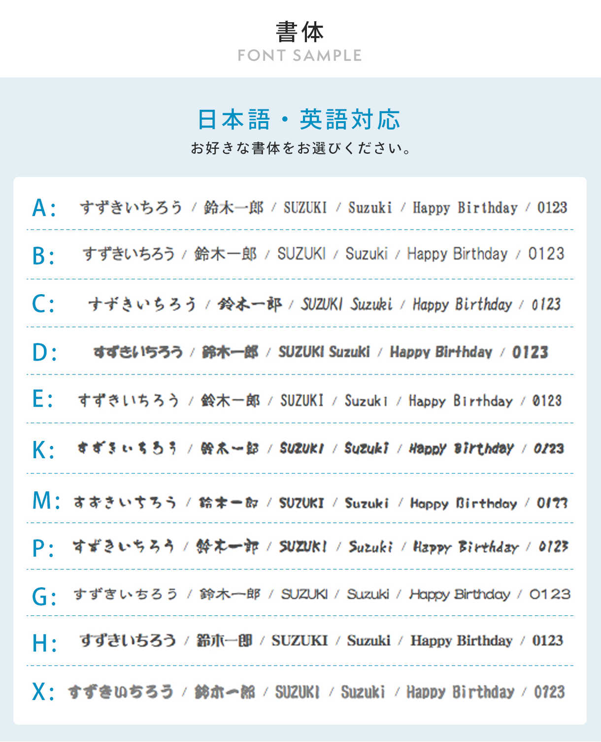 ・「和字英字対応」、「英字のみ対応」、「筆記体」とありますのでご注意ください。