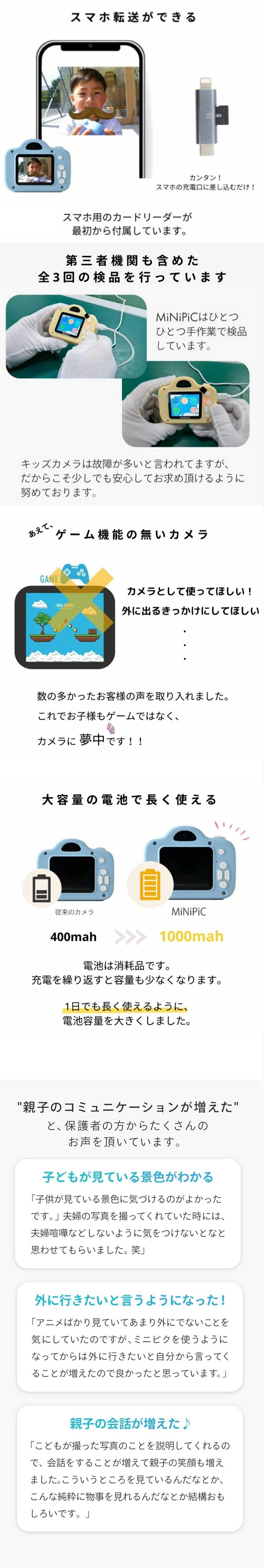 保護者の説明が無くても使用できるように、お子さま用の説明書を用意しました。 また、カメラ内部の文字もひらがなとカタカナで構成がされています。 一人で使おうとする家庭でお子さまの知力も育みます。