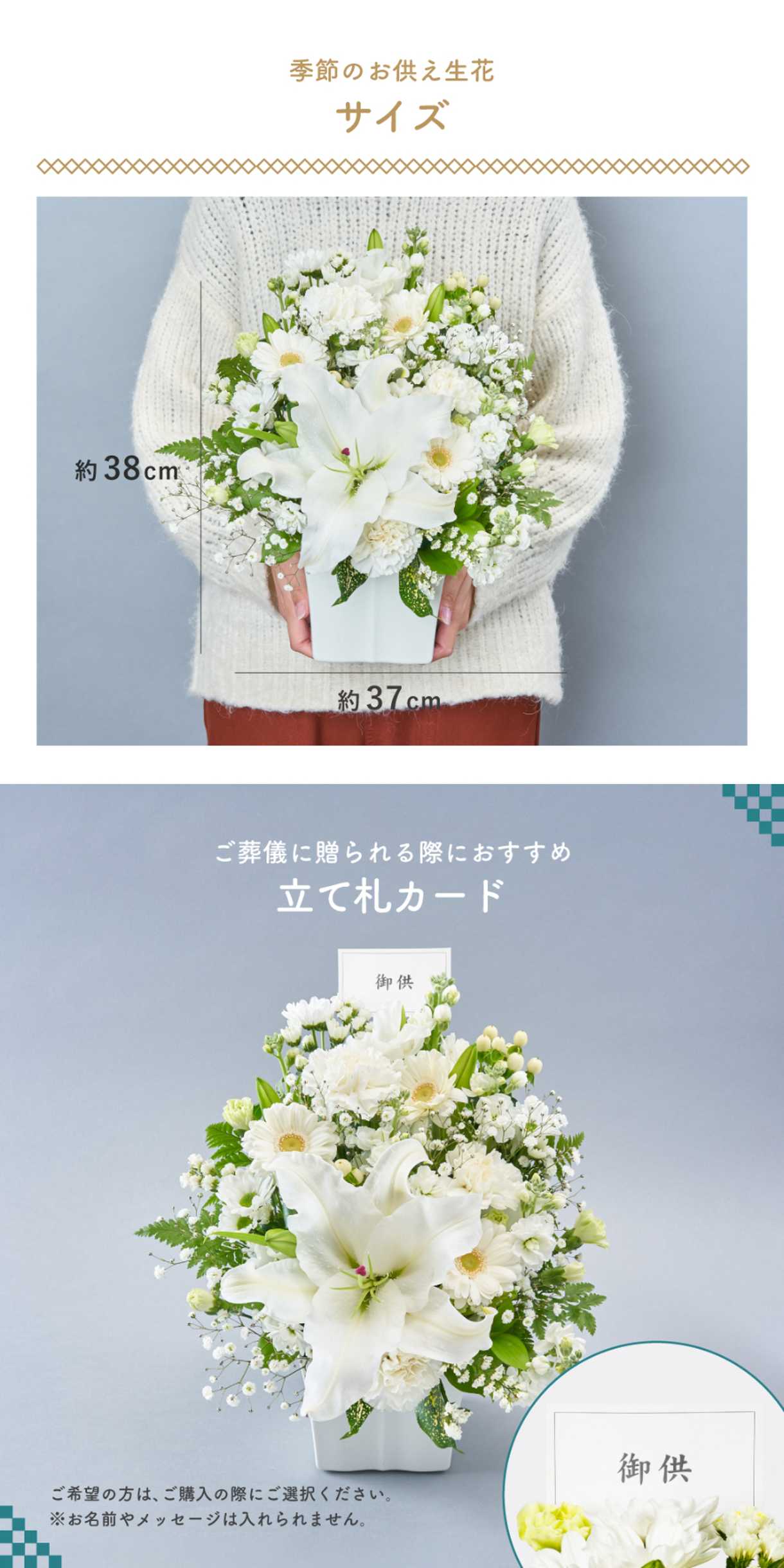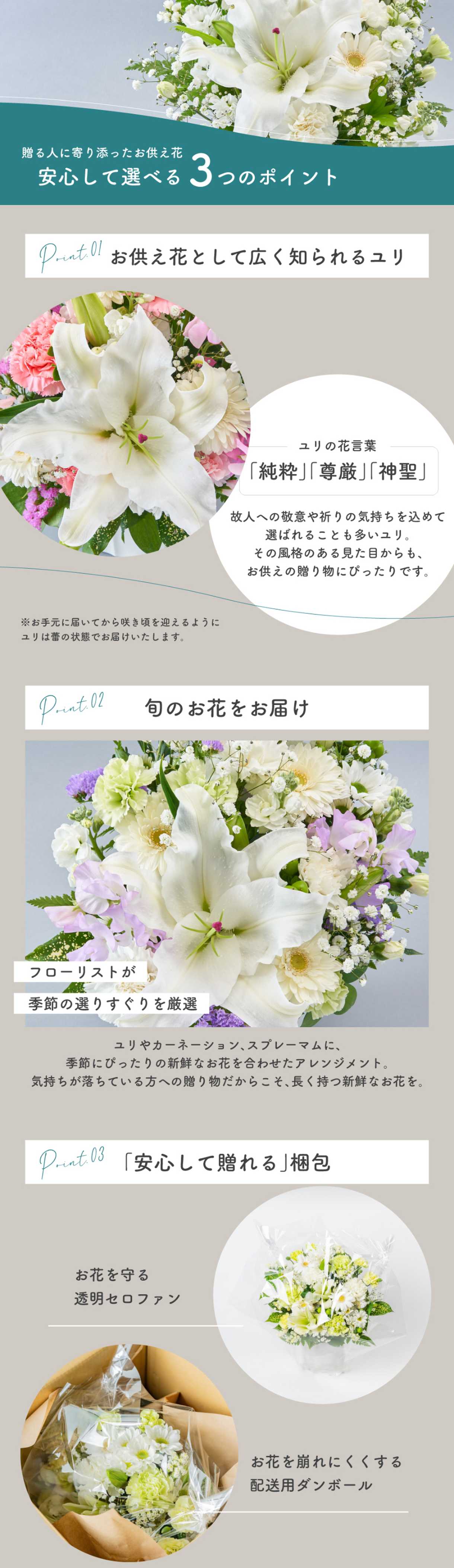 ご先祖様の供養として、また故人を偲ぶ想いを込めて、そのまま飾ることができるため、ご家族の手を煩わせることなく、ご仏前にお供えいただけます。