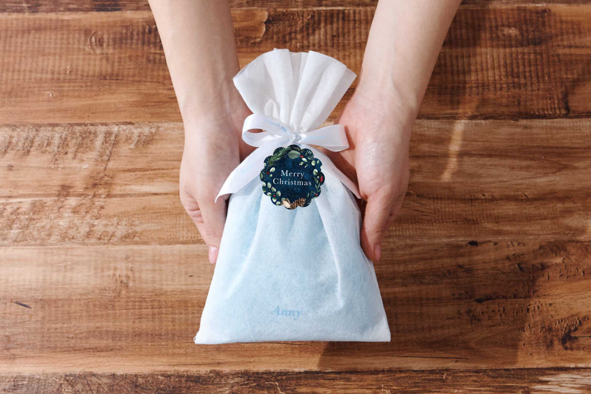Annyオリジナルの巾着袋にクリスマスタグを付けてお届けします。サテンのロゴ入りリボンが上品さを演出します。