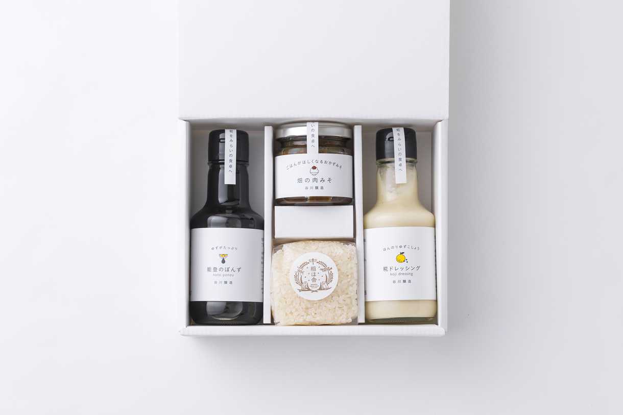 ぽんず、糀のドレッシング、おかずみそと石川県産 減農薬の新米2種を詰め合わせたギフトセットです。