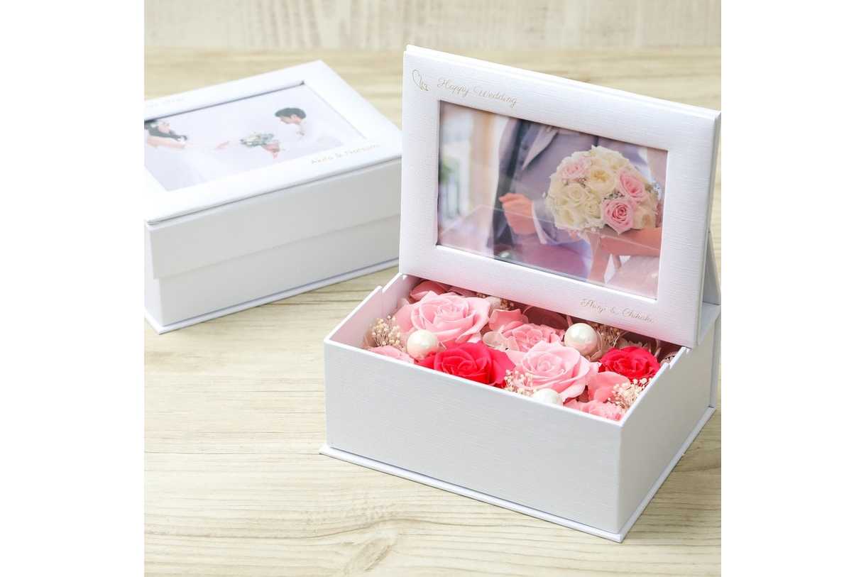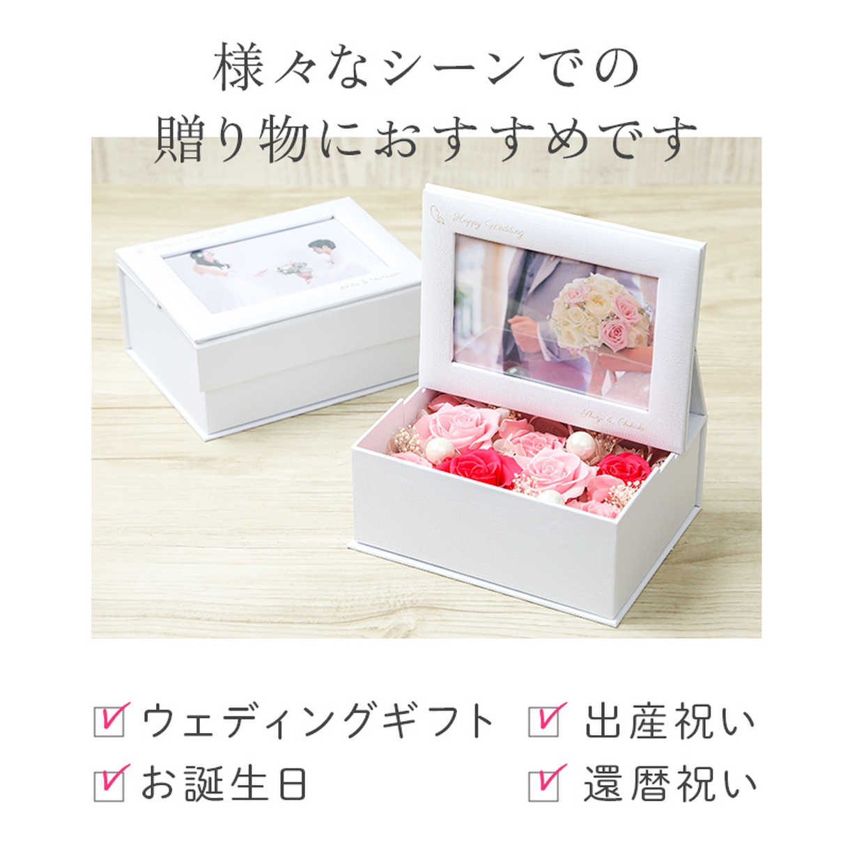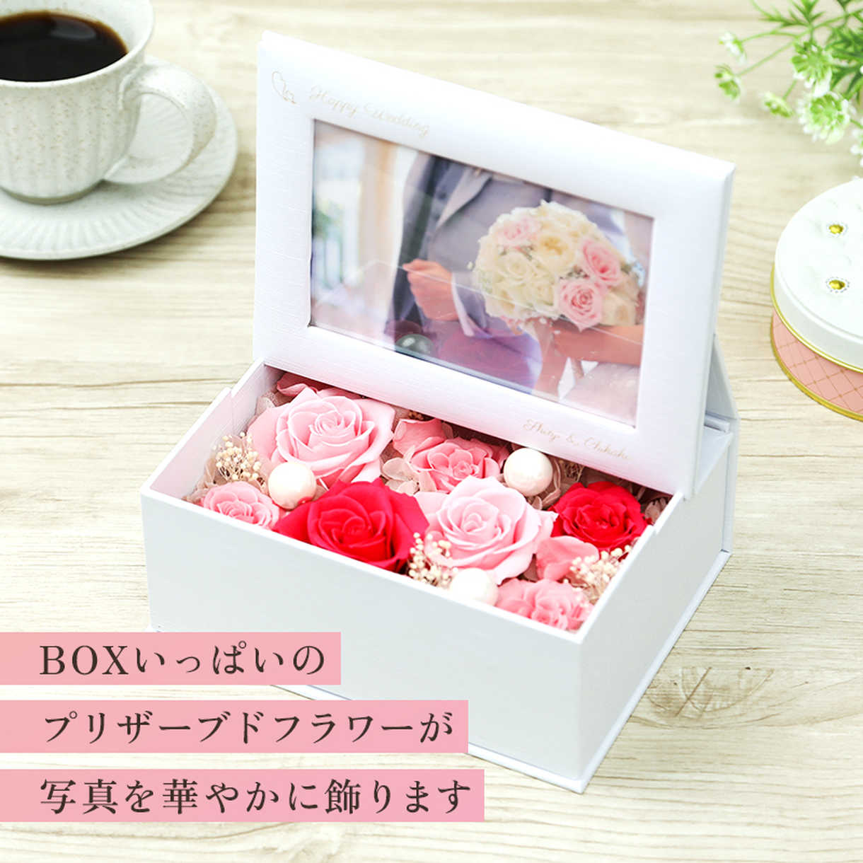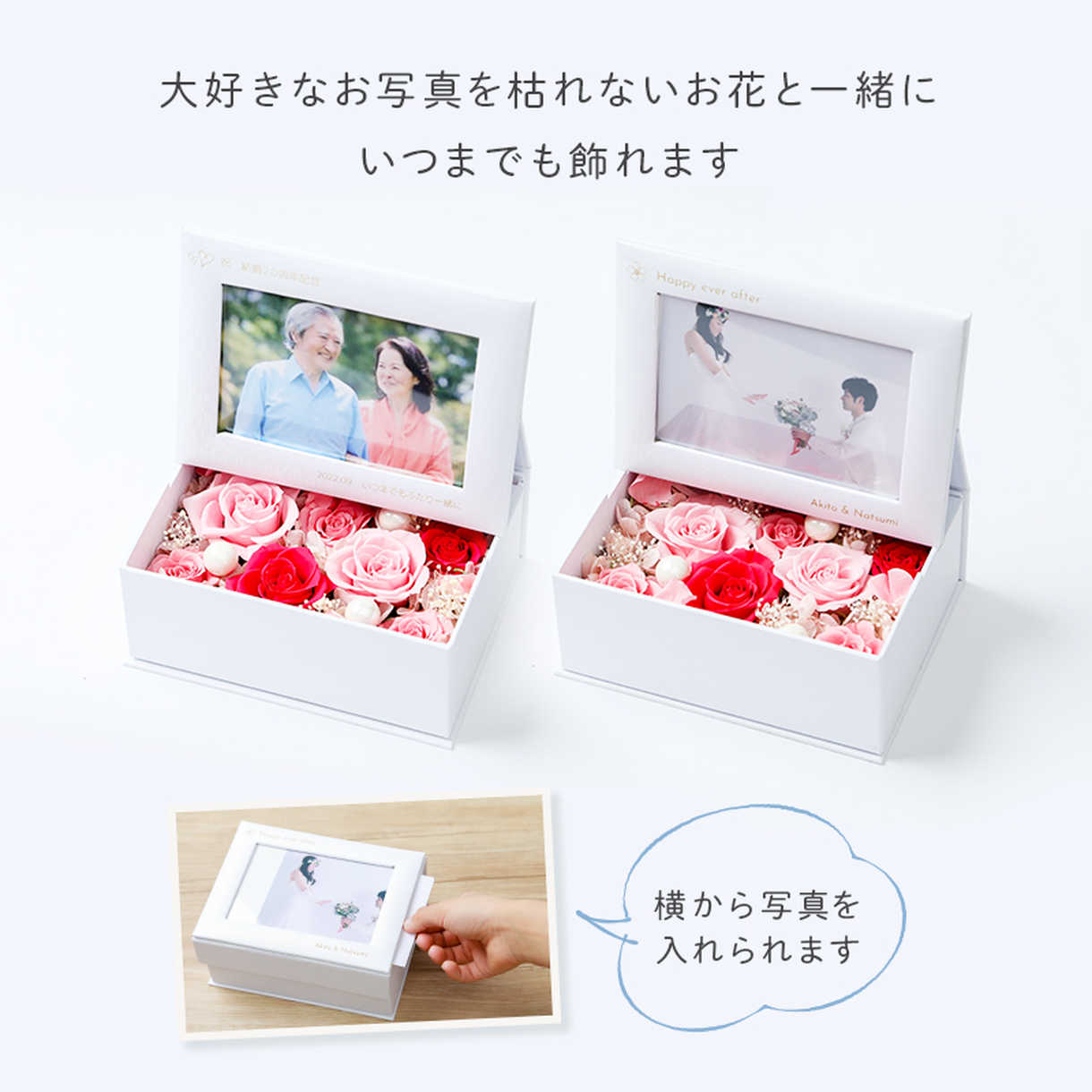 人気のバラのプリザーブドフラワーとフォトフレームがセットになったギフトに最適な商品です。
