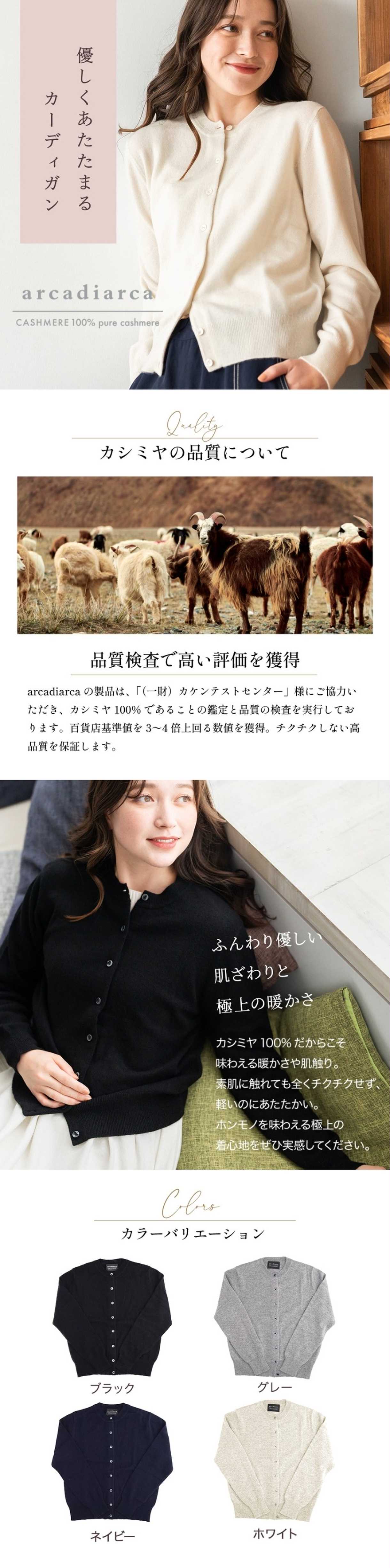 arcadiarcaの品は、「(一財)カケンテストセンター」様にご協力いただき、カシミヤ100%であることの鑑定と品質の検査を実行しております。百貨店基準を3~4倍上回る数値を獲得。チクチクしない高品質を保証します。