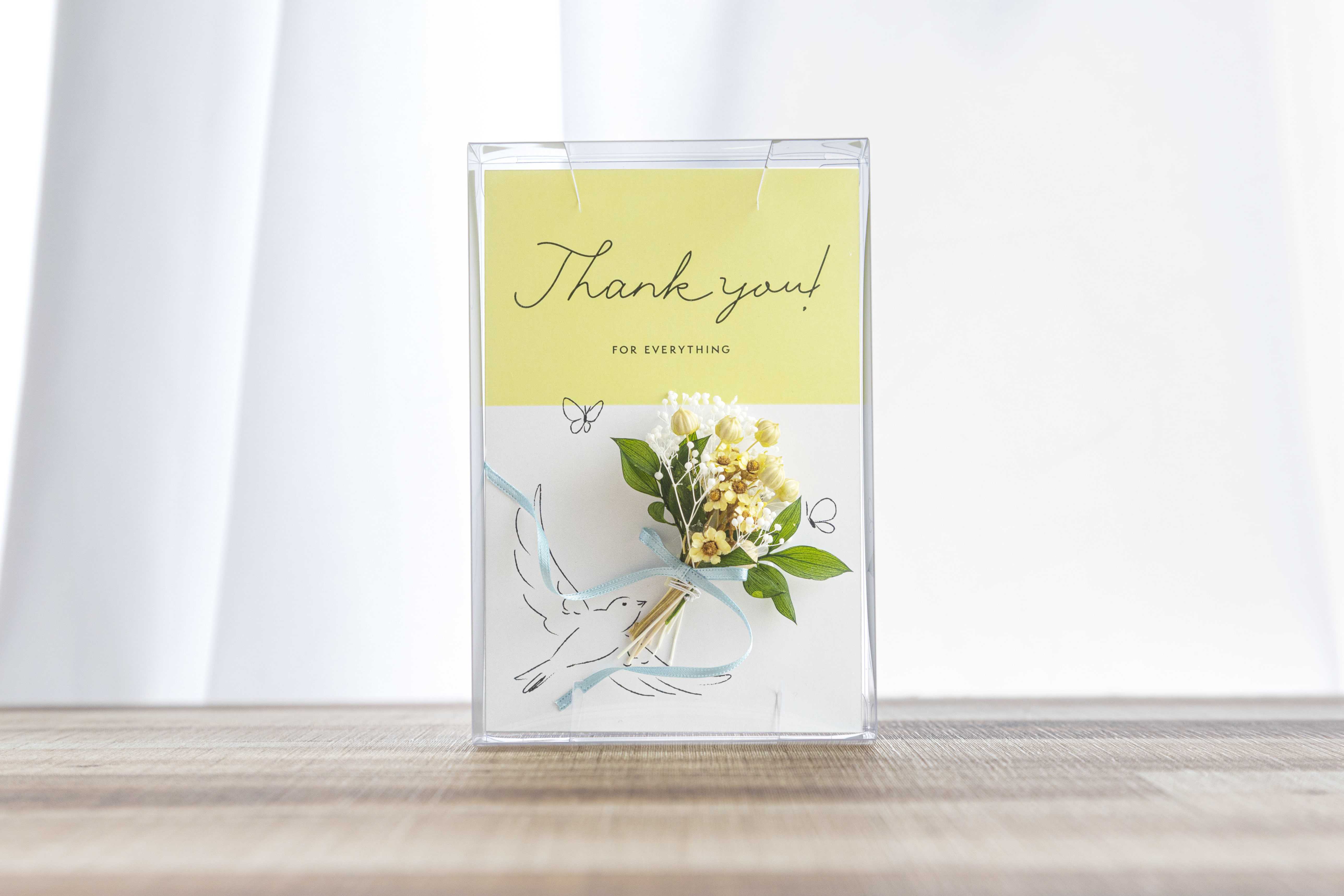 ドライフラワーの可愛いミニブーケがついたグリーティングカードです。