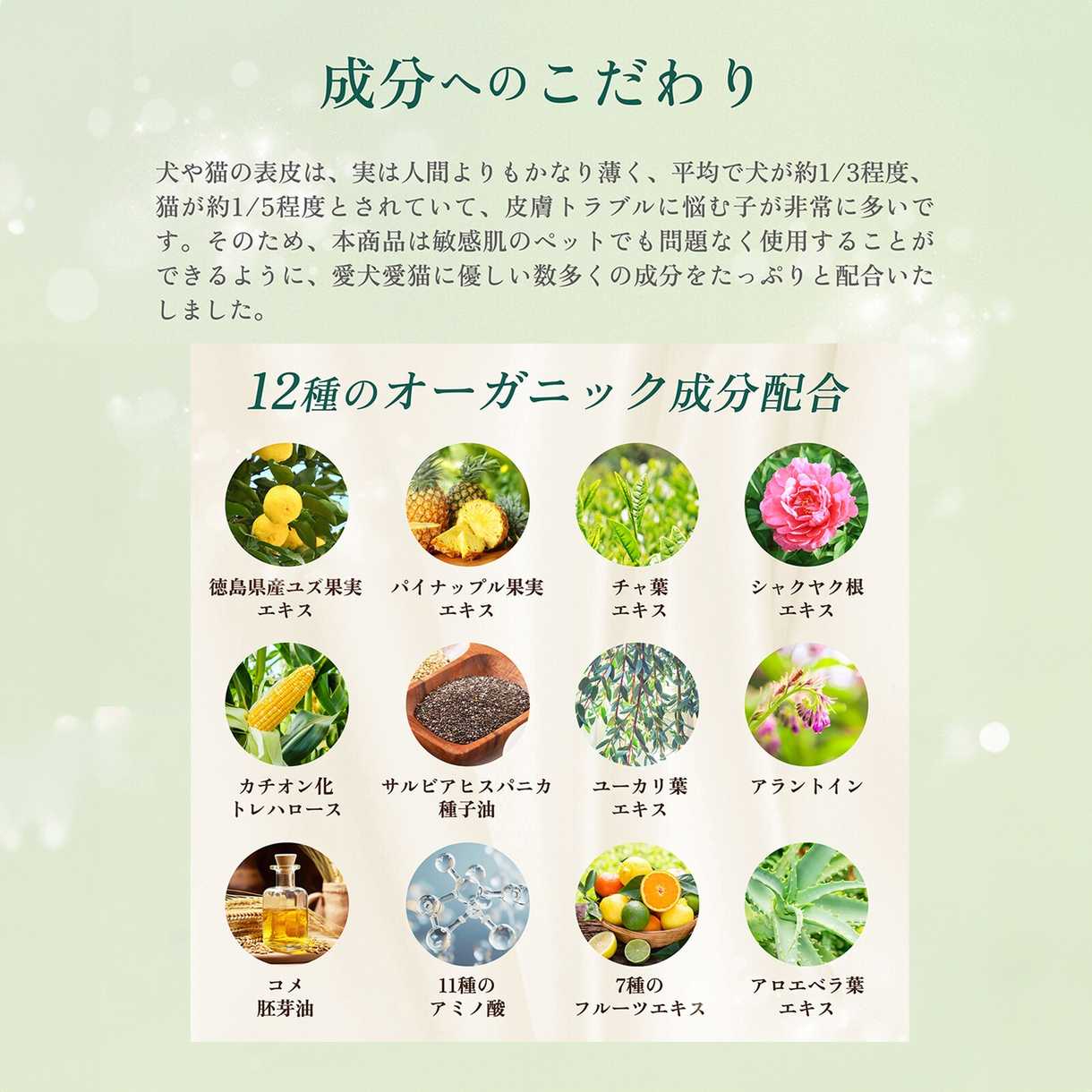 夏の紫外線から皮膚を守り、虫よけや保湿力,免疫力の向上など、皮膚や被毛の安全に徹底的にこだわっています。