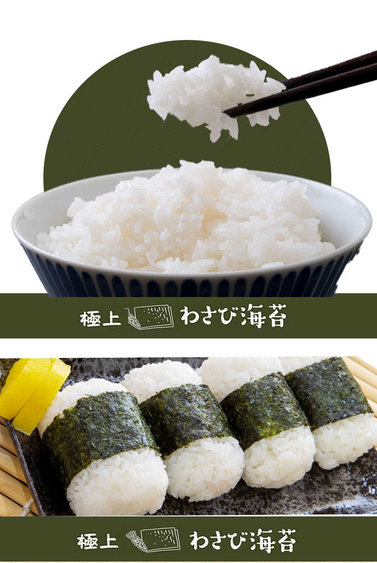 海苔は有明産を使用し、わさびが苦手な方にもおいしくわさびのいいところを味わっていただけるような味付けにしています。