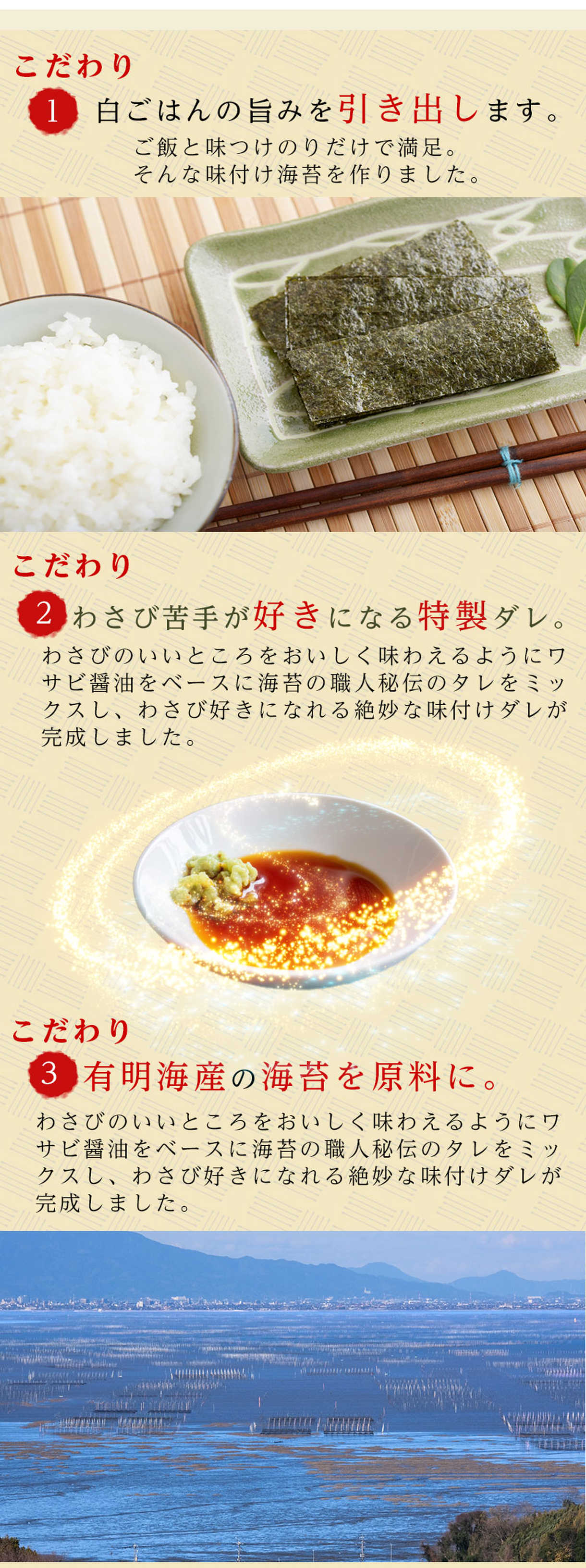 原材料:乾海苔(有明産)、醤油、糖類(ブドウ糖)、昆布エキス、発酵調味料、食塩、オキアミエキス、 たん白加水分解物、ポークエキス、調味料酵母エキス、ワサビ茎、野菜パウダー、植油脂 / 調味料(アミノ酸等)、香辛料抽出物、アルコール第3リン酸カルシウム(一部に小麦大豆、牛肉、ごまを含む)