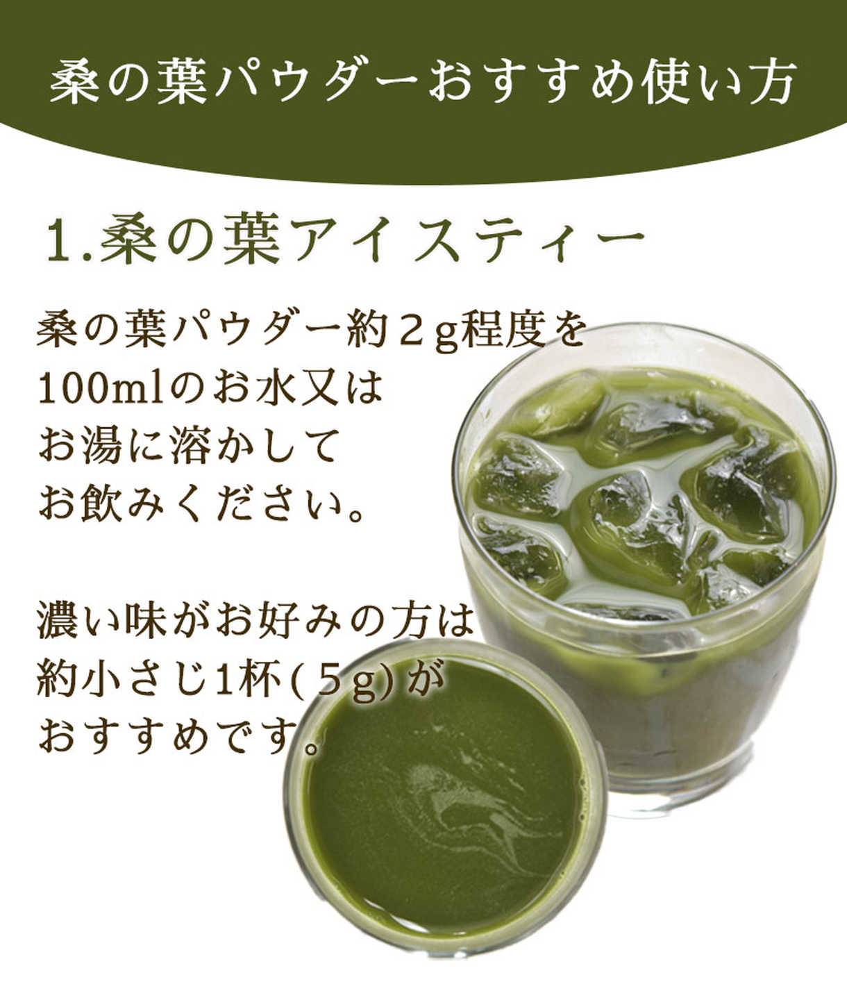 ホットでもアイスでも1年間季節を問わず、お楽しみいただる桑の葉粉末です。