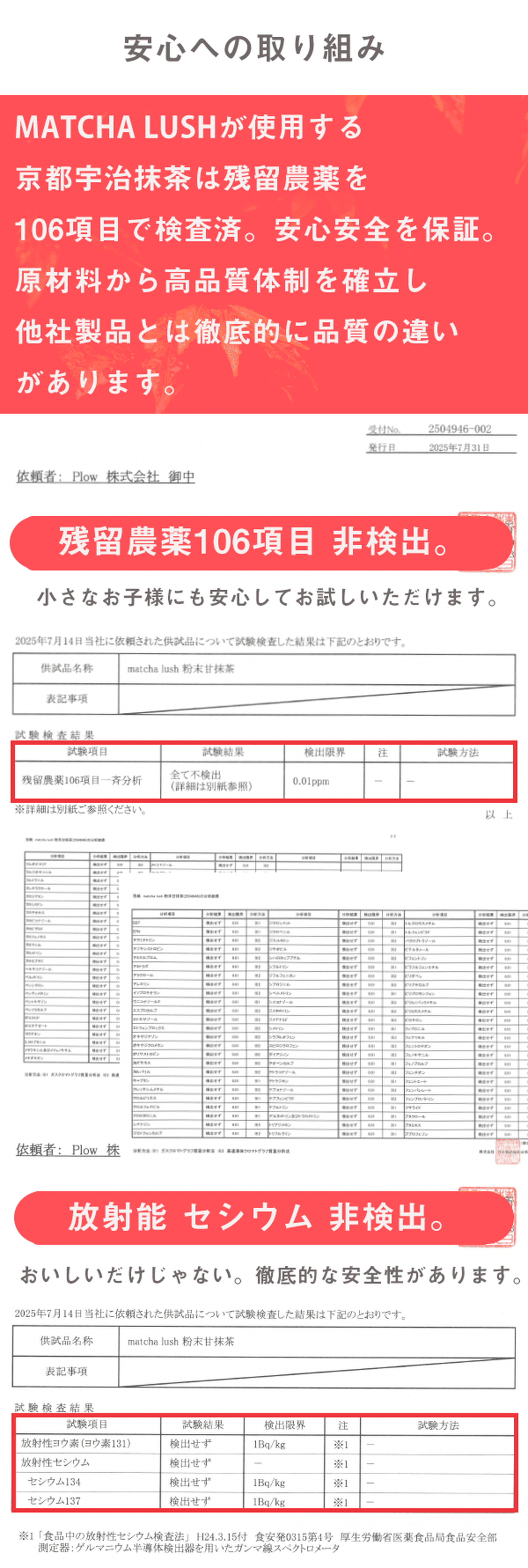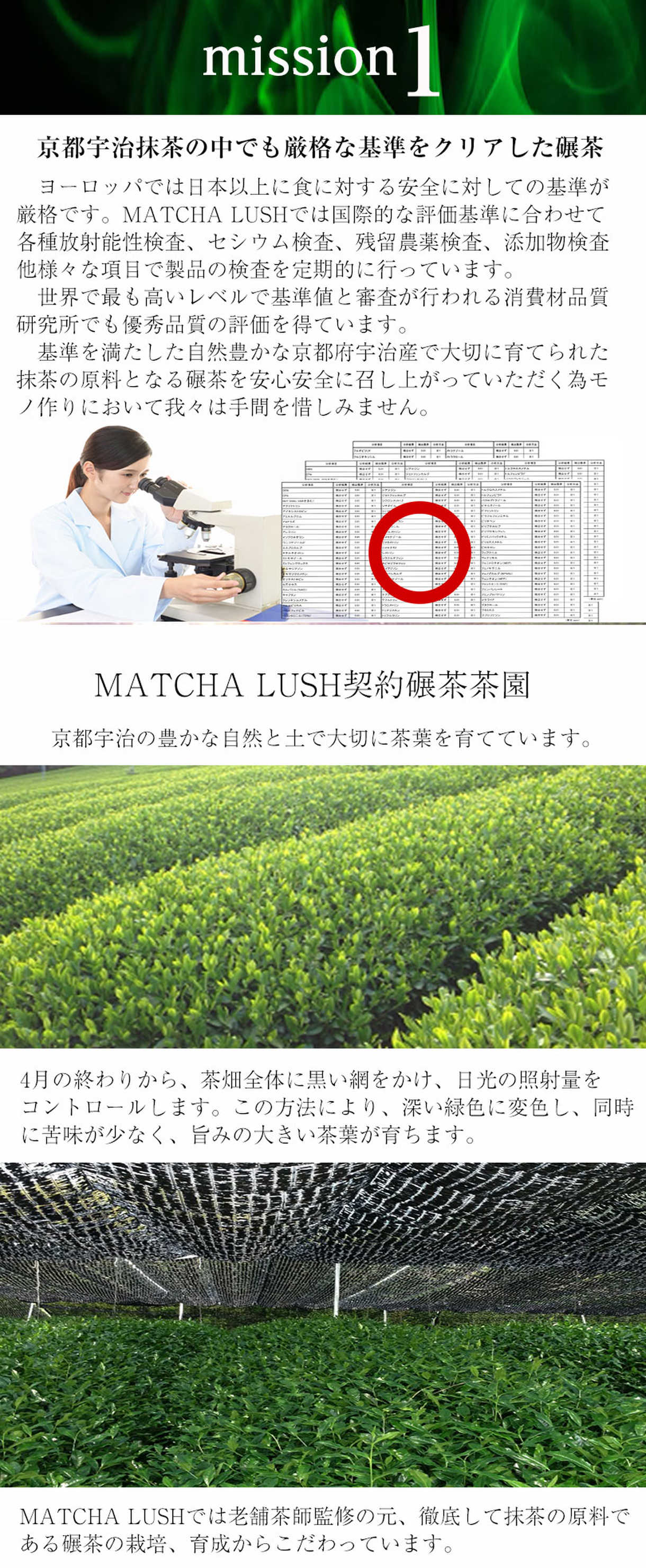 抹茶の質、含有量、製造工程、技術の差。 使用する京都宇治抹茶は放射能性検査、セシウム検査、残留農薬検査等厳格に検査を終えており、その意味でもワンランク上の宇治抹茶と言えます。
