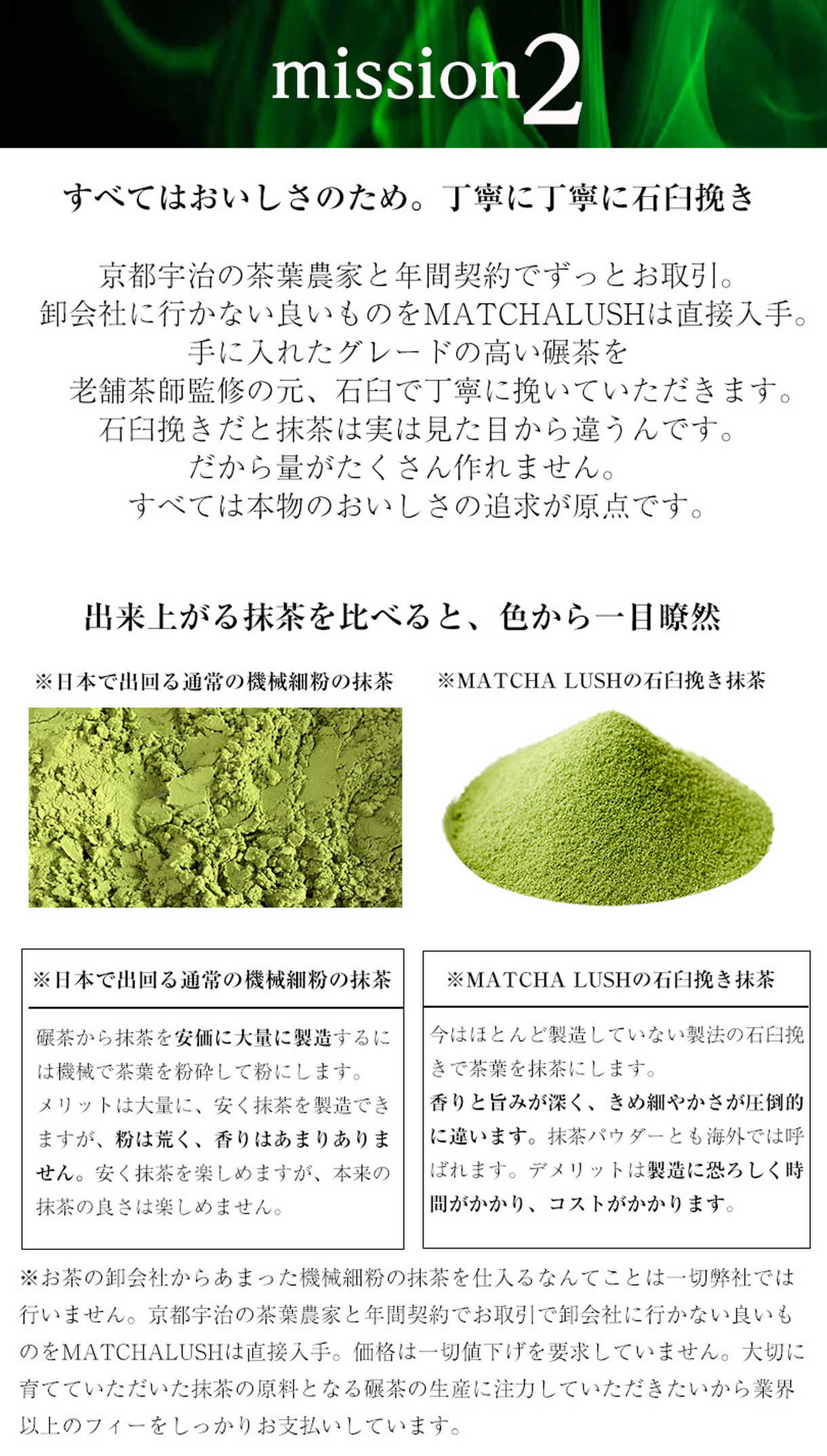 Matcha LUSHの京都宇治甘抹茶粉末は味、香り、深みが違います。