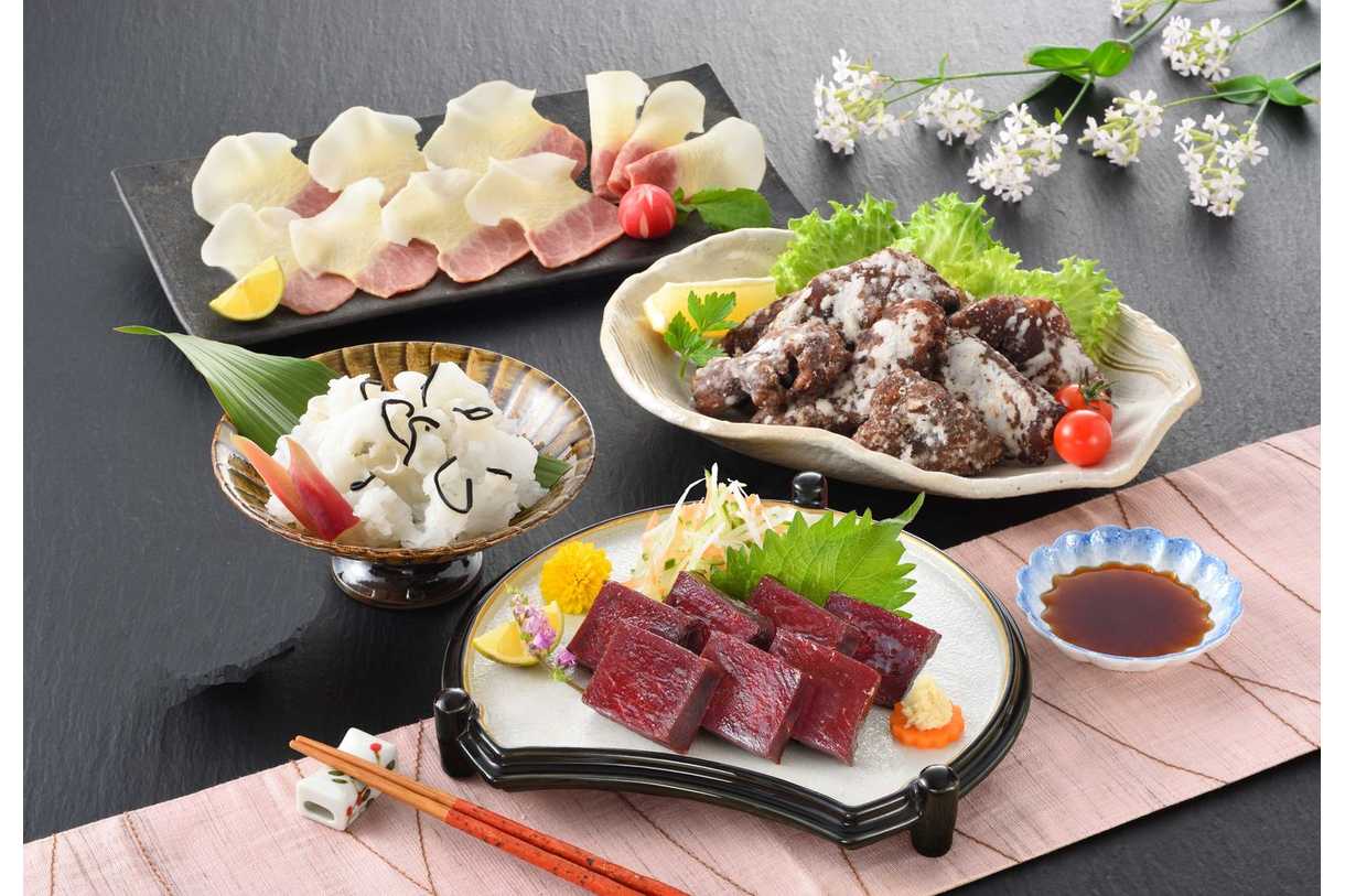 鯨竜田揚げ150g、鯨赤身肉(刺身用)100g、鯨おばいけ100g、鯨ベーコンスライス50g