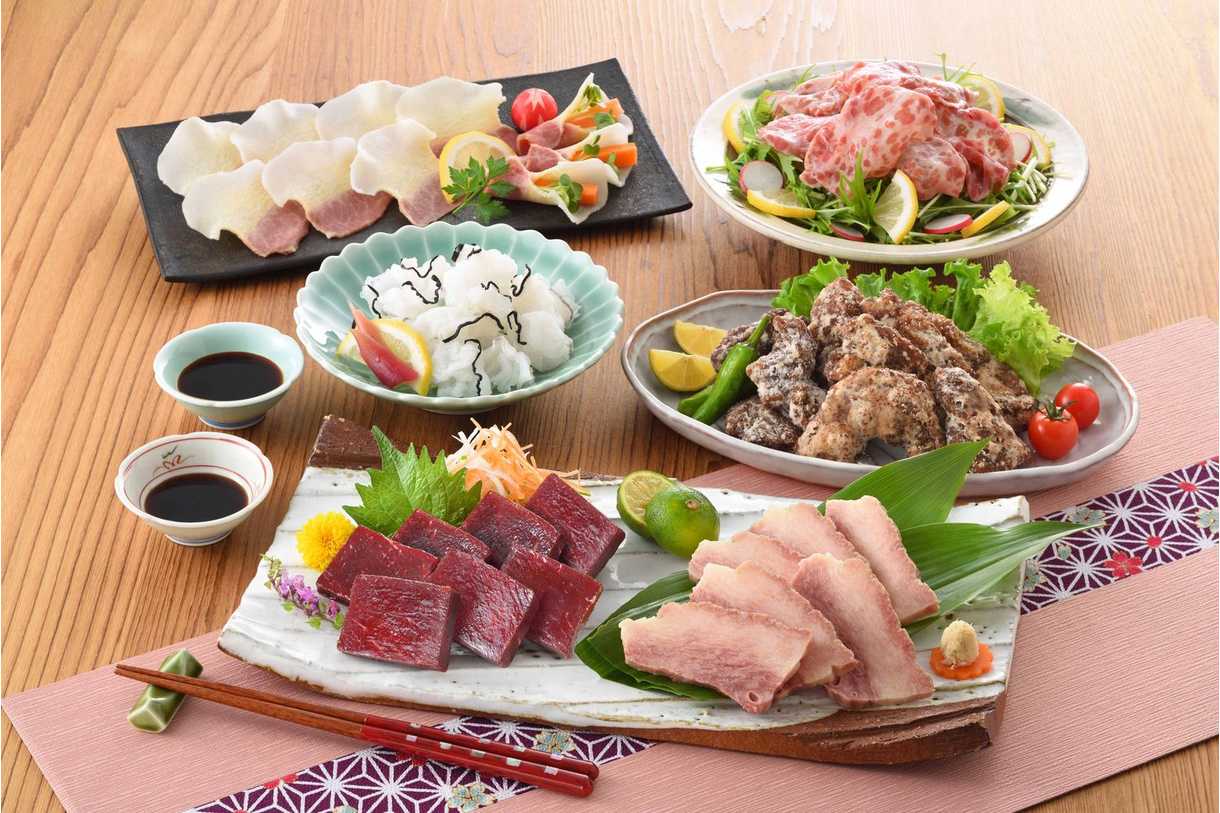 鯨竜田揚げ150g、鯨赤身肉(刺身用)100g、鯨おばいけ100g、鯨舌ボイル90g、鹿の子スライス50g、鯨ベーコンスライス50g