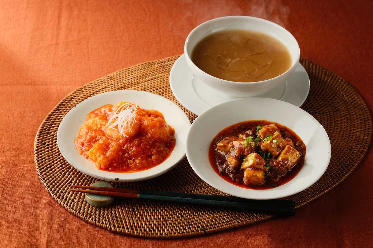 ふかひれの姿煮をはじめ、中華の総菜や食材を専門に扱う老舗「日本橋 古樹軒」から、自慢の総菜3種を。ふかひれの中でもコラーゲンが最も多く含まれている胸びれを使ったふかひれスープは、一滴残らず味わいたい。大きめの海老を使った海老のチリソース煮や、中華料理の定番として人気の高い麻婆豆腐とセットでどうぞ。