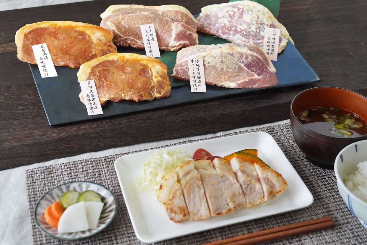 芦田文兵衛商店の赤味噌漬け・六甲味噌製造所の白粒味噌漬け・保地味噌醸造所の米こうじ味噌漬け・足立醸造の黒大豆味噌漬け・花房商店の赤味噌漬け 各70g