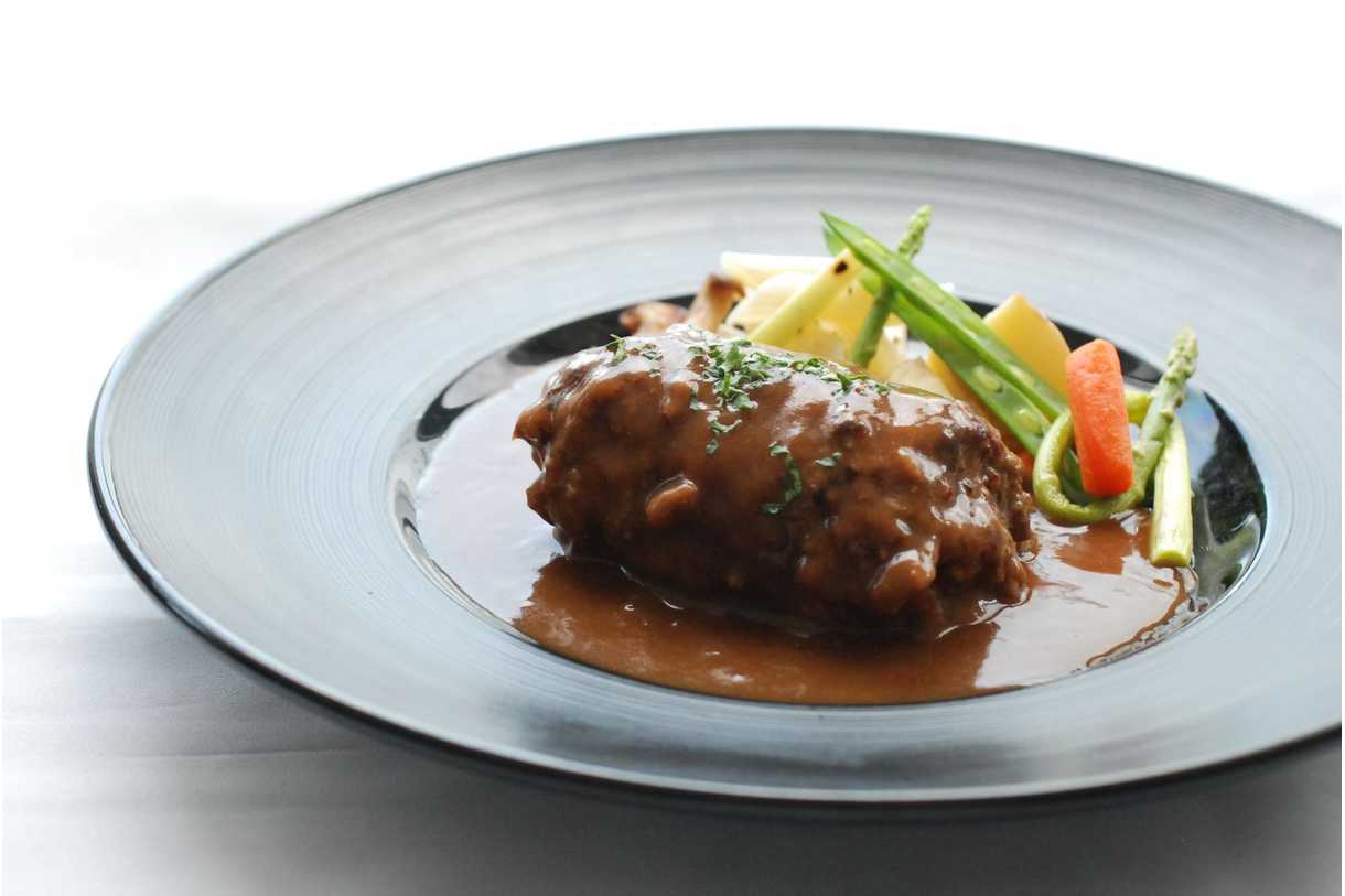 本格フレンチ「ブラッセリ―トモ」。黒毛和牛本来の味わいと玉ねぎの食感を楽しめるこだわりのハンバーグを、華やかな甘みのあるマルサラ酒を使用したソースで煮込みました。