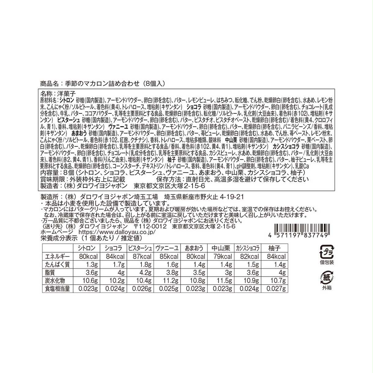シトロン・あまおう・ショコラ・ヴァニーユ・ピスターシュ・中山栗・ユズ・カシスショコラの各1個計8個入りです。
