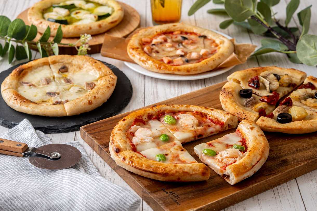 スモークチキンとローストきのこのトマトピザ・まるずわいがにとだだ茶豆のトマトピザ・アンチョビとローストガーリックのピザ・魚介たっぷりのマリナーラピザ・ローストいかのジェノベーゼピザ×各1枚(直径約15cm)