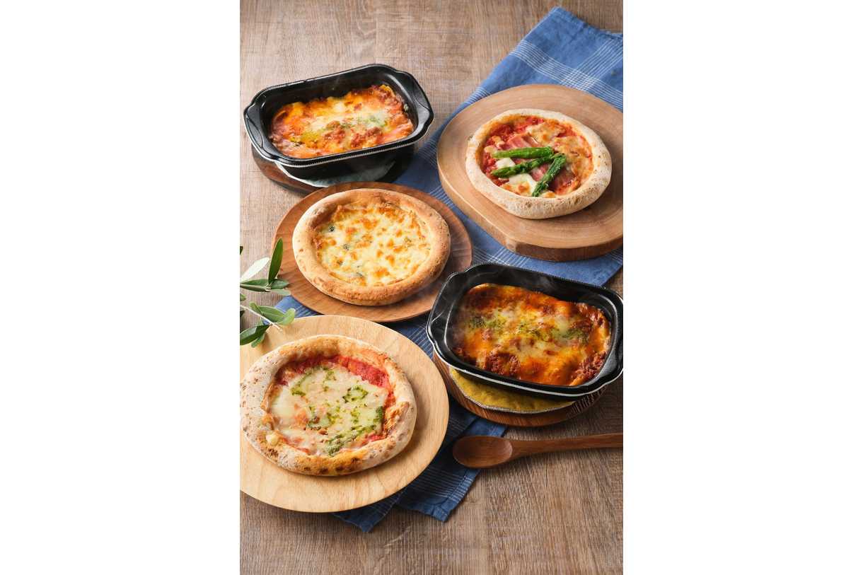 ラザニアボロネーゼ210g×2個、ナポリピッツァ3枚[マルゲリータ・クワトロフォルマッジ・本格ベーコンとアスパラガス×各1枚(直径約15cm)]
