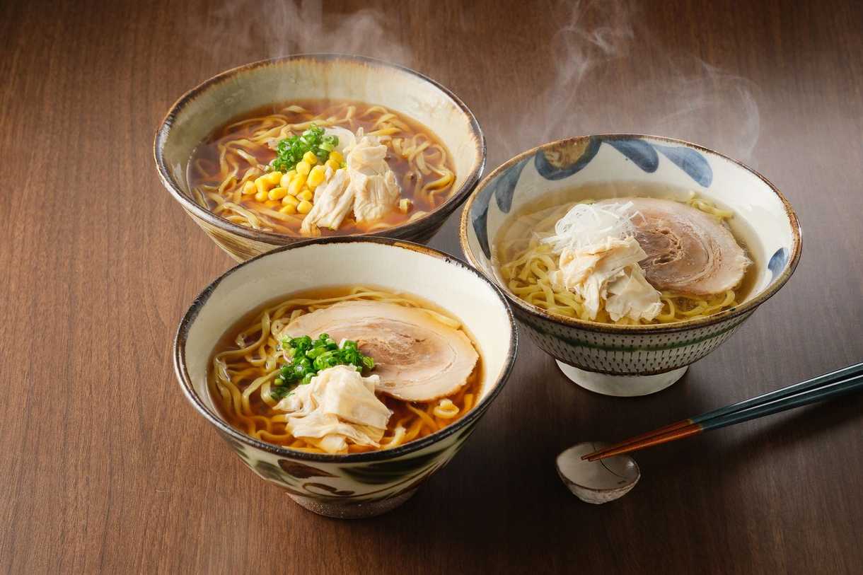 国産大豆を使用し、一枚一枚丁寧に引き上げたゆばを麺に練りこみ、トッピングにもゆばを添えました。鶏がらベースのあっさりとした醤油味、瀬戸内産の塩を使ったしお味、信州みそを使用したみそ味の3種セットです。