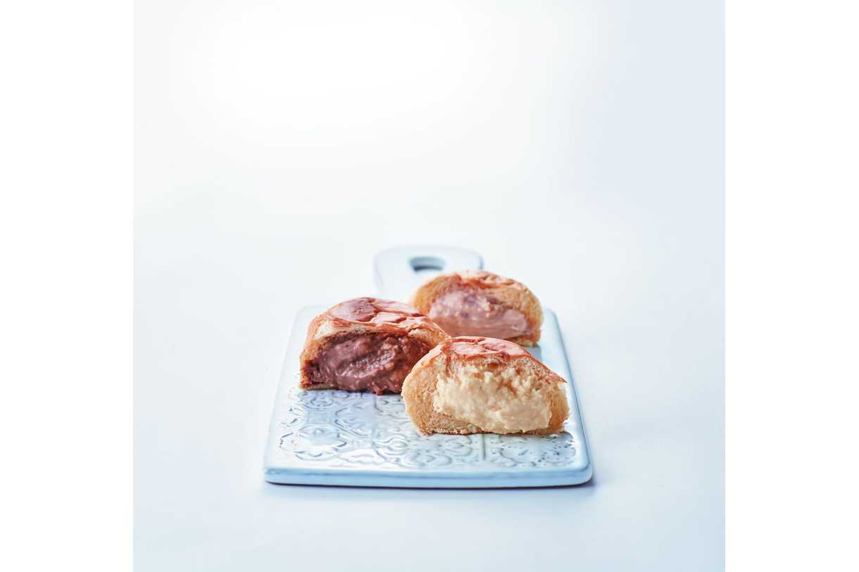 広島県三原市にて昭和8年に創業した八天堂の看板商品、ふんわりしたパンにたっぷりのクリームを入れて作った、冷やして食べるくりーむパンです。カスタード・ストロベリー・チョコレートの3種をアソートしました。