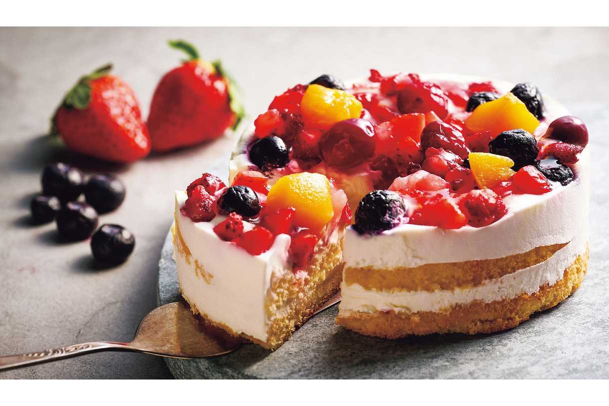 4種のベリーと黄桃をトッピングした華やかなフルーツケーキです。
