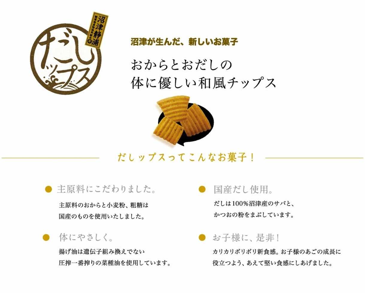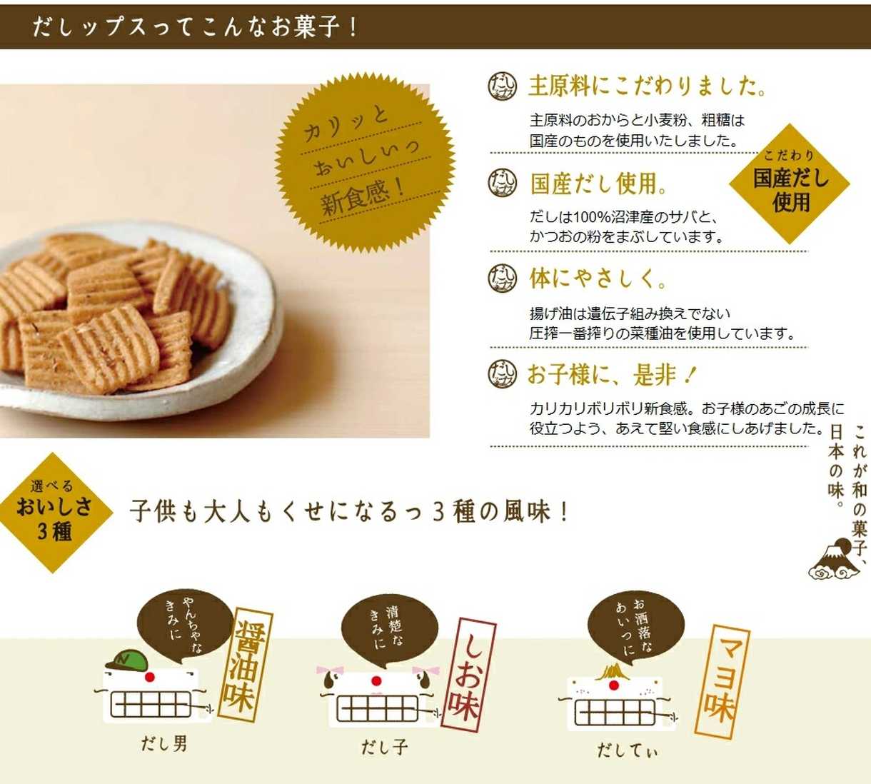 静岡県沼津が生んだお菓子、だしっぷす。体にやさしい原料なのに一度食べたらクセになる食感です。