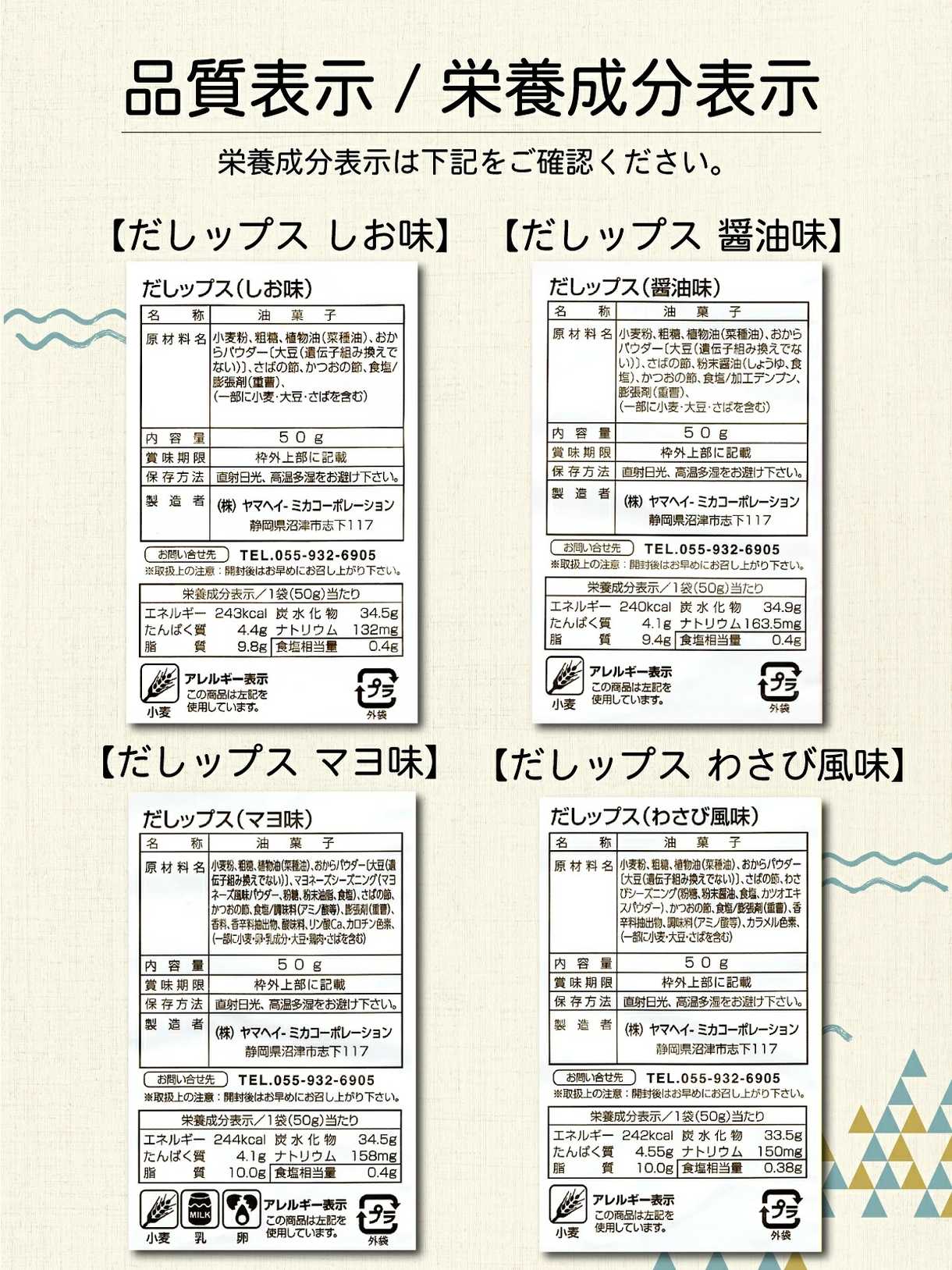 マヨ味:小麦粉、粗糖、植物油(菜種油)、おからパウダー、マヨシーズニング(マヨネーズ風味パウダー、粉糖、粉末油脂、食塩)、さばのふし、かつおのふし、食塩/調味料(アミノ酸等)、膨張剤(重曹)、香料、香辛料抽出物、酸味料、リン酸Ca、カロチン色素、(一部に小麦・卵・乳成分・大豆・鶏肉・さばを含む)