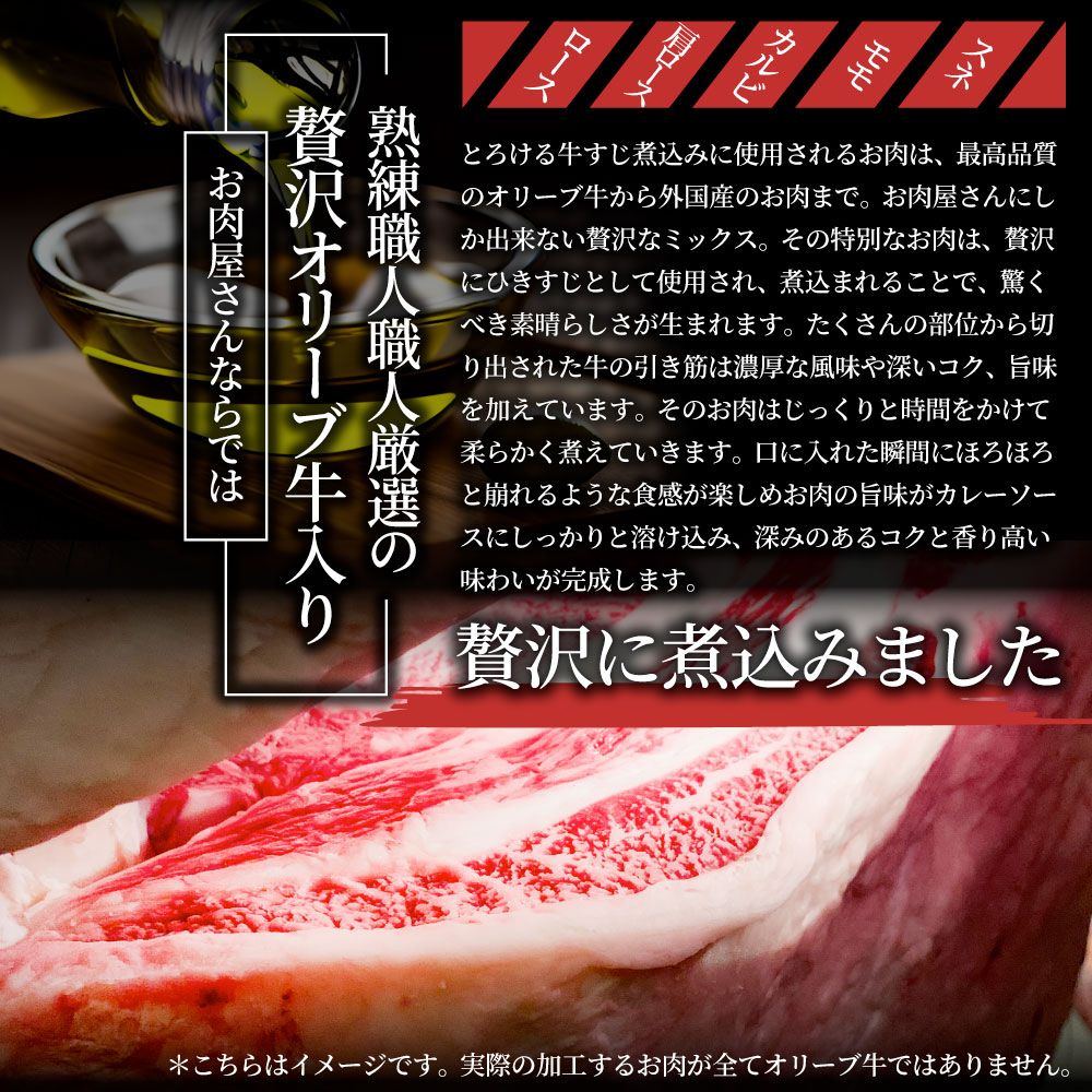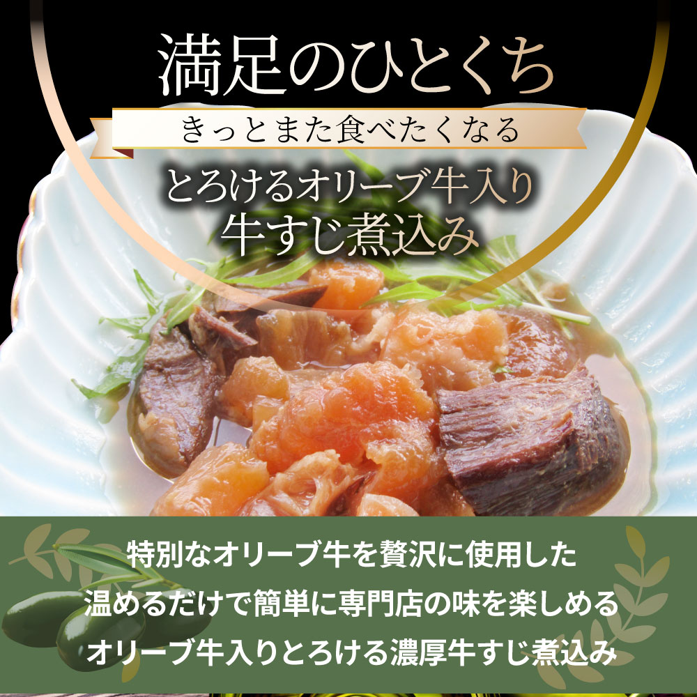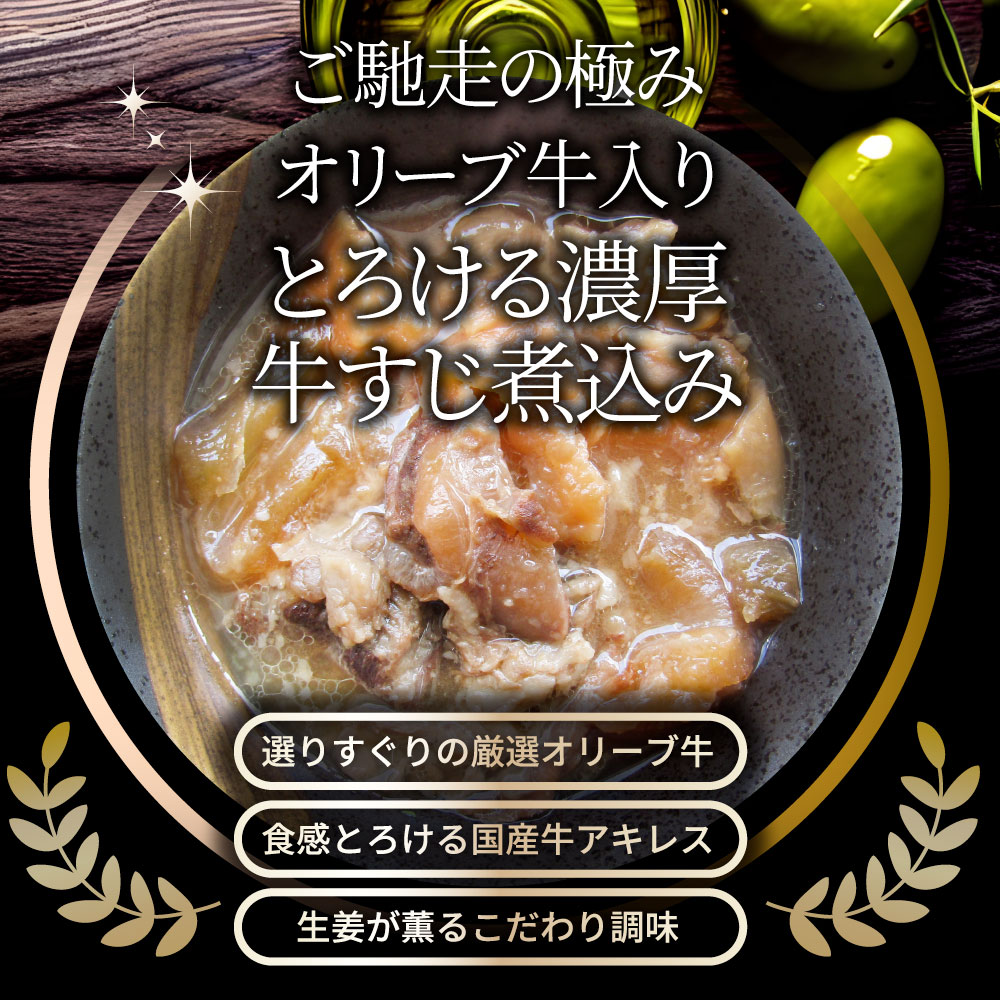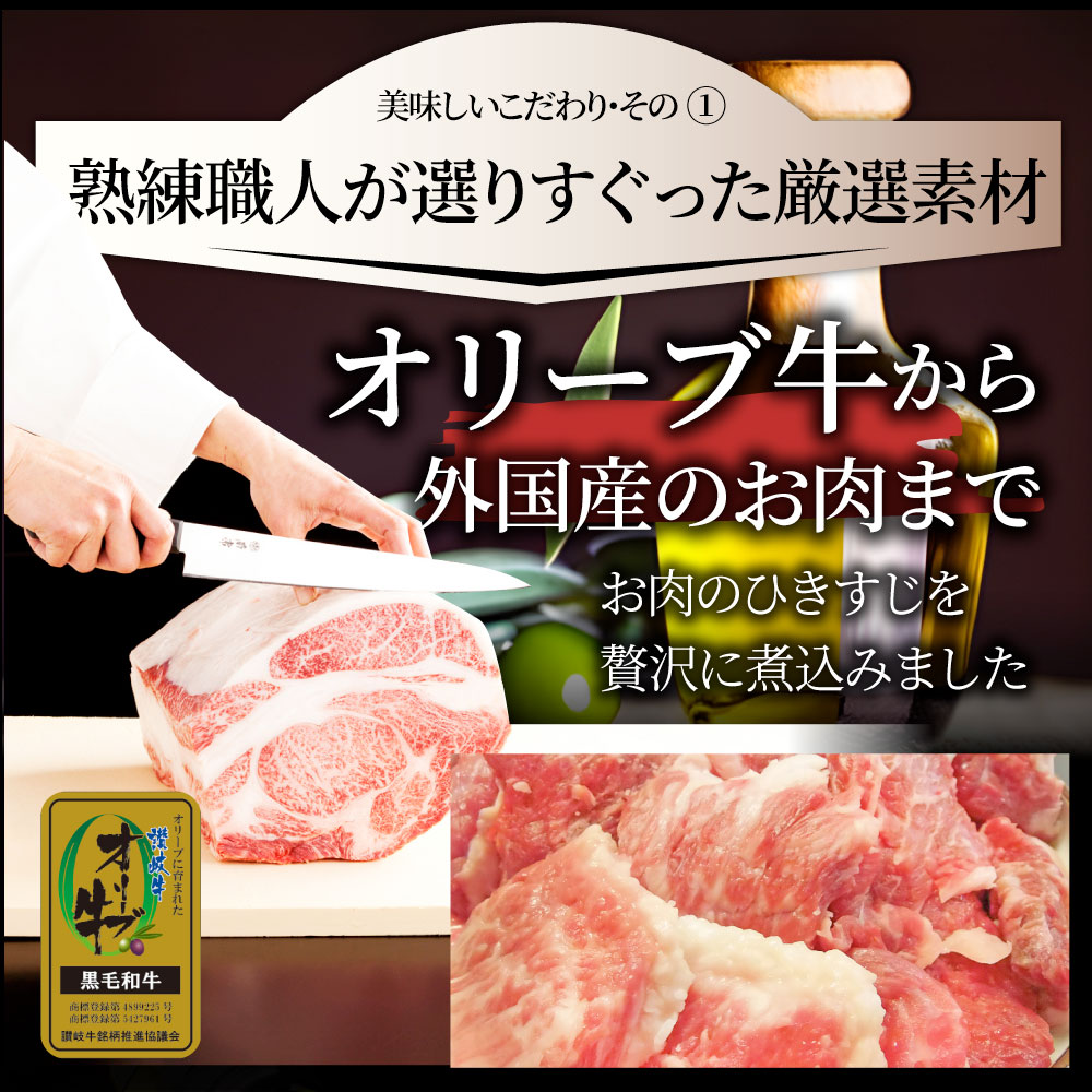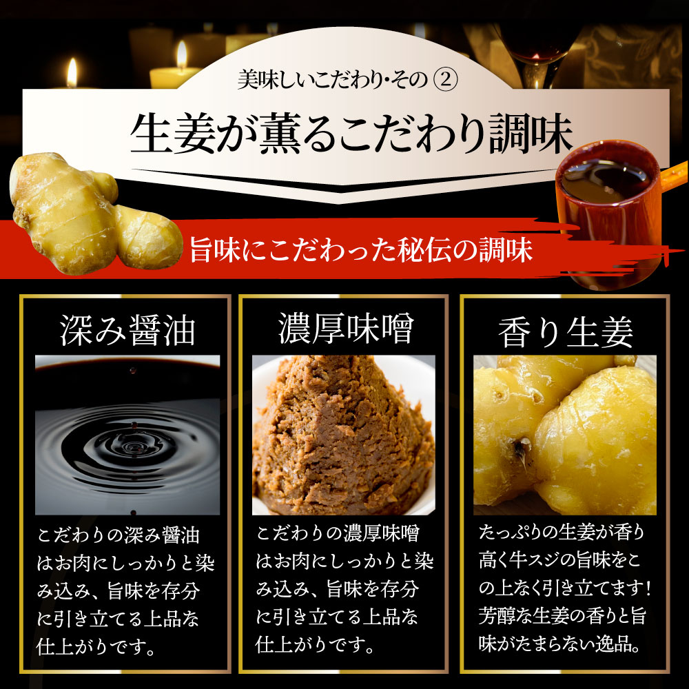 牛スジ(国産、外国産)、醤油(本醸造)(大豆:遺伝子組み換えでない)、風味原料(かつおぶし、こんぶ)糖類(果糖ぶどう糖液糖、砂糖)、食塩、米発酵調味料、米酢、酵母エキス、魚介エキス、調味料(アミノ酸等)、(原材料の一部に小麦、大豆を含む)
