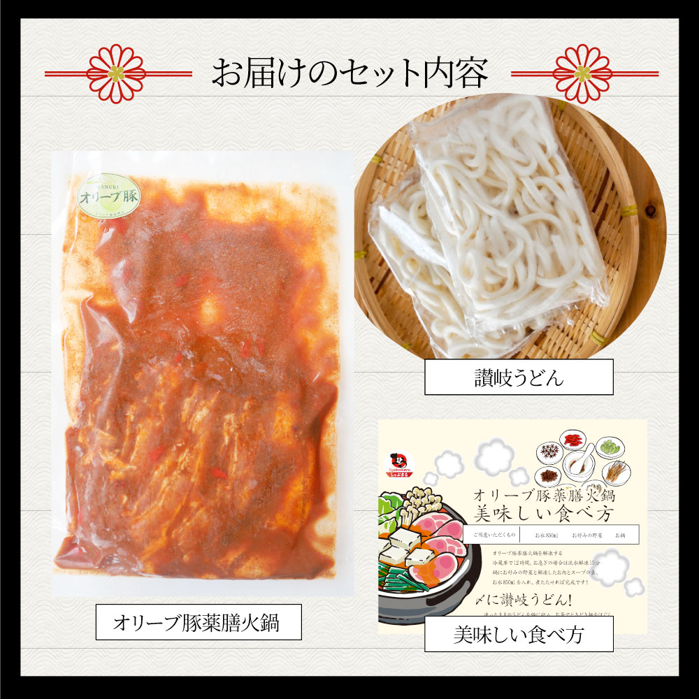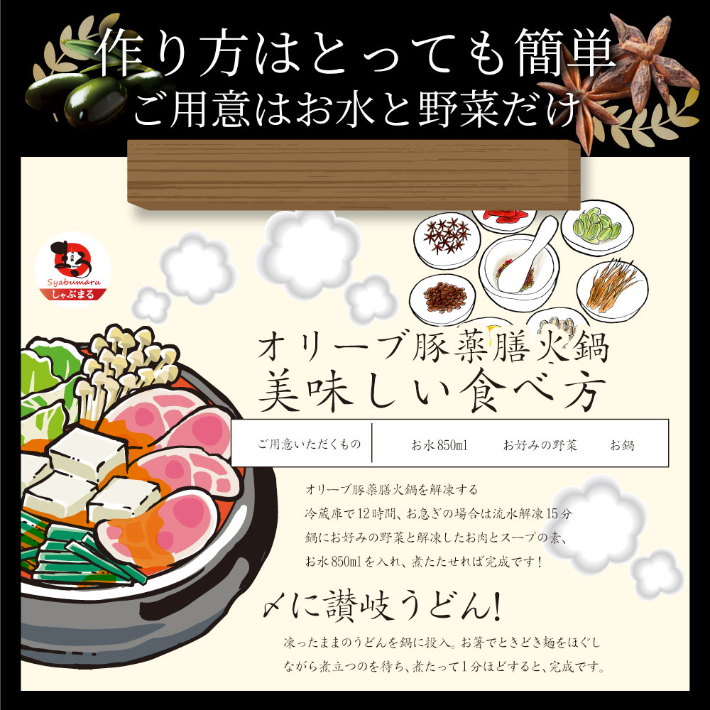 豚肉(香川県産オリーブ豚)醤油(国内製造)、食塩、ぶどう糖果糖液糖、みりん、砂糖、たん白加水分解物混合物(牛肉、豚肉、ゼラチン含む)水あめ、さば節、かつお節、かつお調味エキス、こんぶ、ラー油、豆板?、醸造調味料、乾燥唐辛子、花椒、チキンエキス、にんにくペースト、生姜ペースト、スターアニス、シナモン、花椒、クローブ,ちんぴ、クコの実/調味料(アミノ酸等)、アルコール、カラメル色素、甘味料(ステビア、カンゾウ)(一部に小麦・大豆・鶏肉を含む)