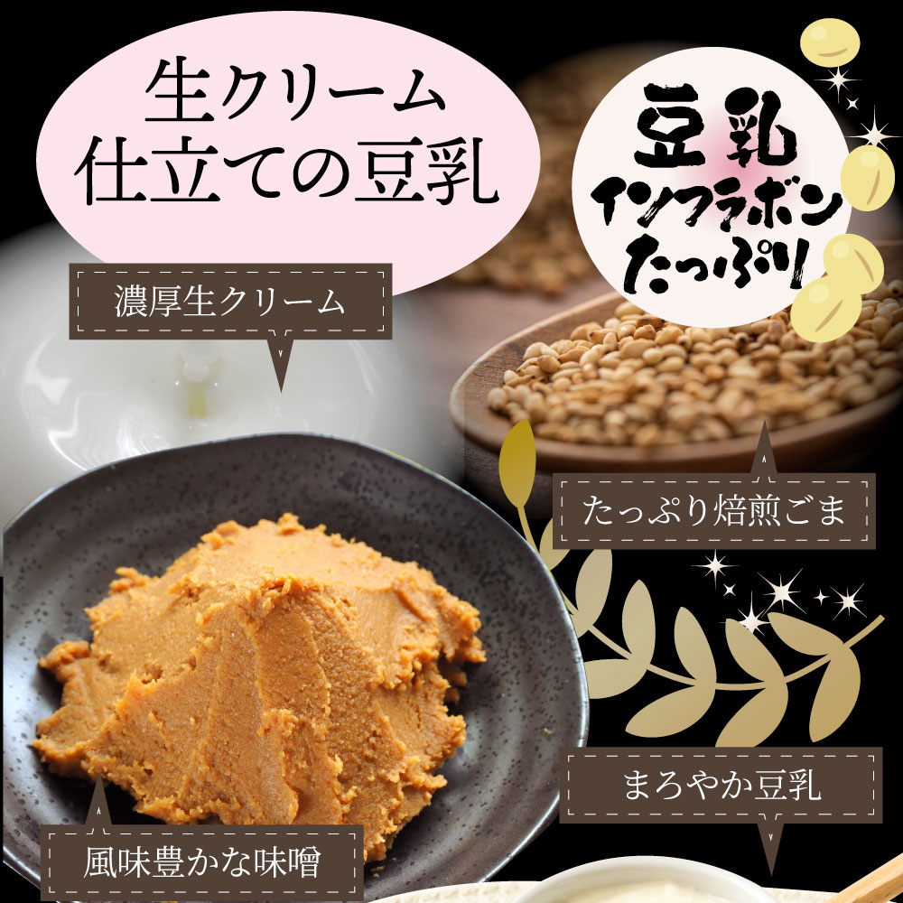 オリーブ豚(バラ)、豆乳(国内製造)、植物油脂、食塩、砂糖、たん白加水分解物、醤油、粉末状大豆たん白、ねりごま、動物油脂、生クリーム、畜肉エキス、味噌、酵素分解卵黄粉末、香辛料、ごま/調味料(アミノ酸等)、酸味料、乳化剤、増粘多糖類、酵素 (一部に小麦・卵・乳成分・牛肉・ごま・大豆・鶏肉・豚肉を含む)