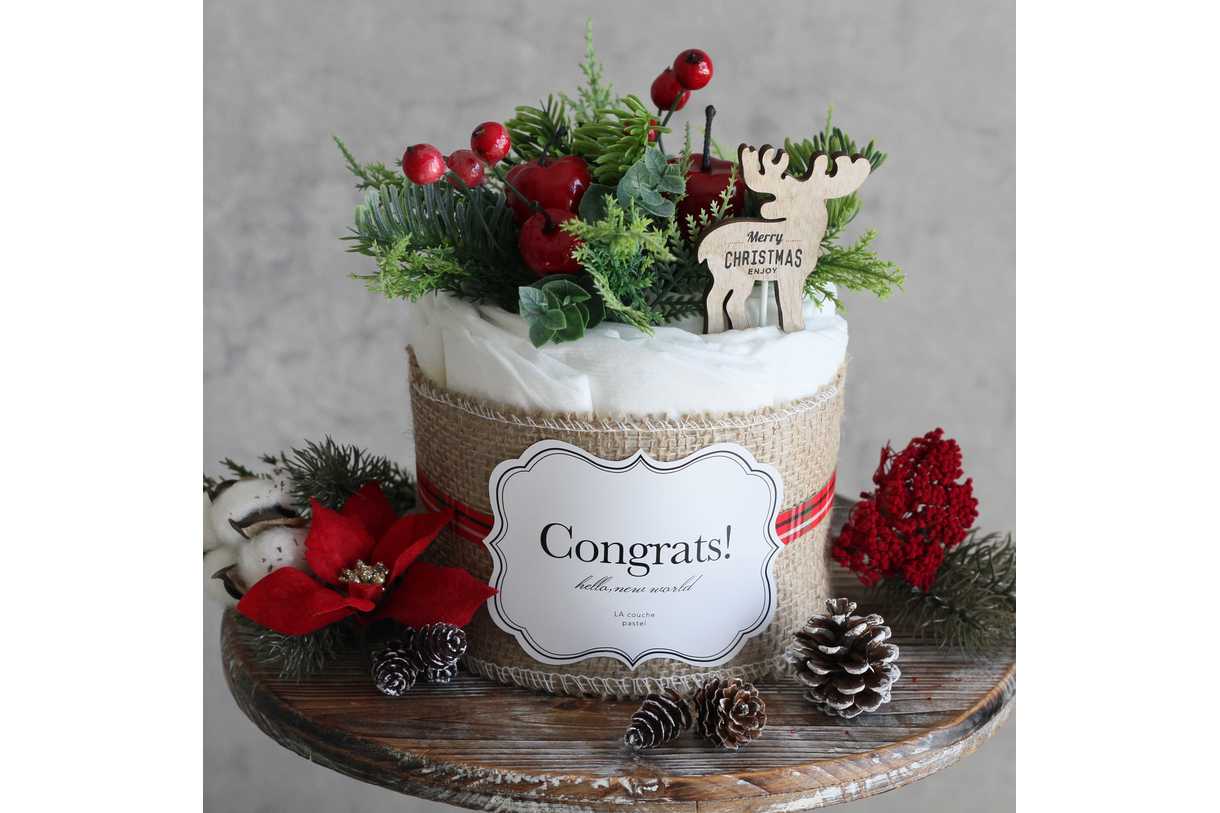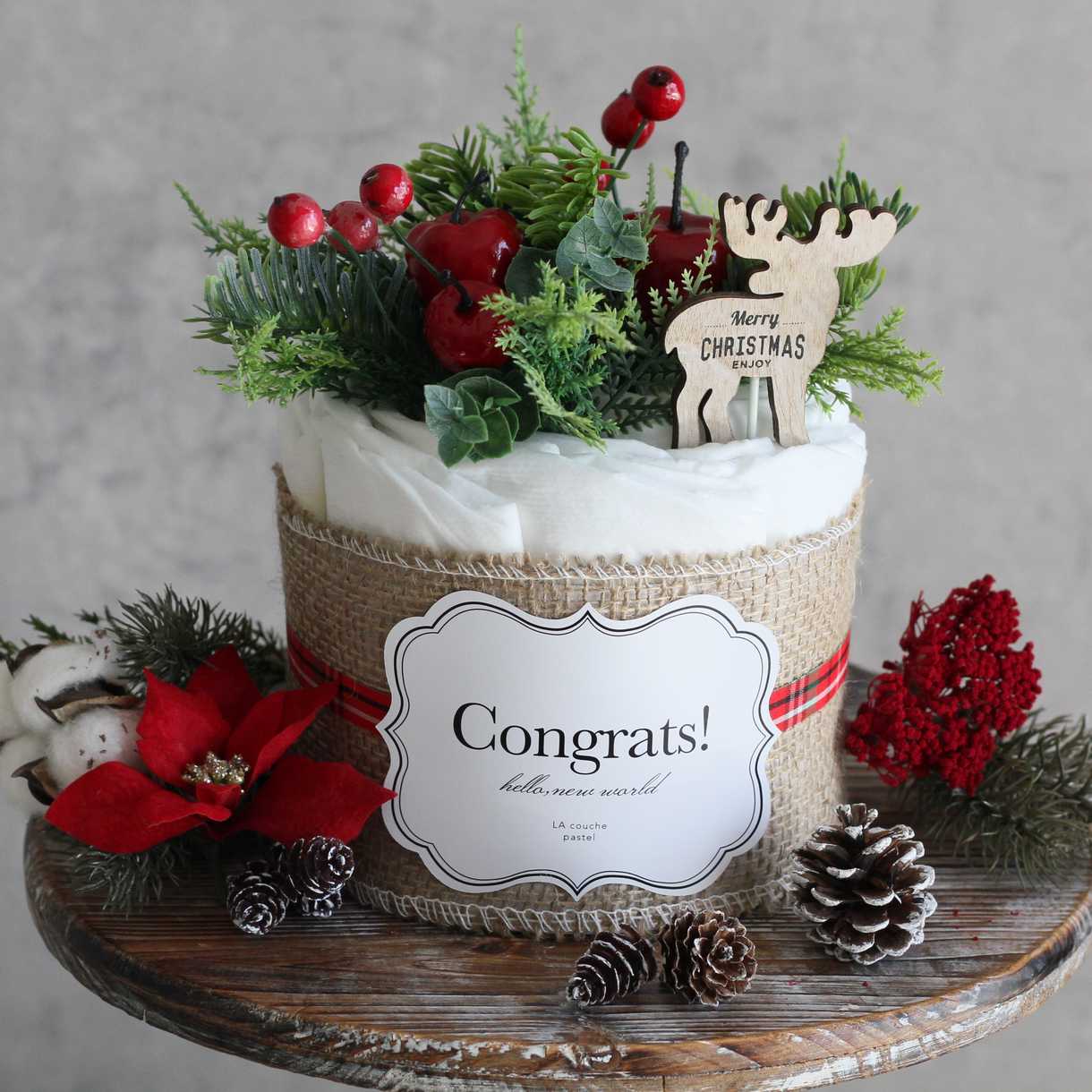 クリスマスシーズンのお祝いに、クリスマスカラーのノーブルなダイパーケーキ(おむつケーキ)をご用意しました。頑張っているママに、まだケーキが食べられない赤ちゃんに、サンタさんからのおむつケーキをどうぞ♪