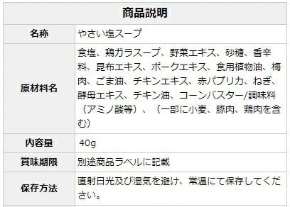 ・天日塩ラーメンスープ:食塩、ラード、チキンエキス、野菜エキス、胡麻油、香辛料、アミノ酸液、チキン油、砂糖、調味料(アミノ酸等)、増粘多糖類、甘味料(甘草)(原材料の一部に小麦、大豆、豚肉、魚介類を含む)