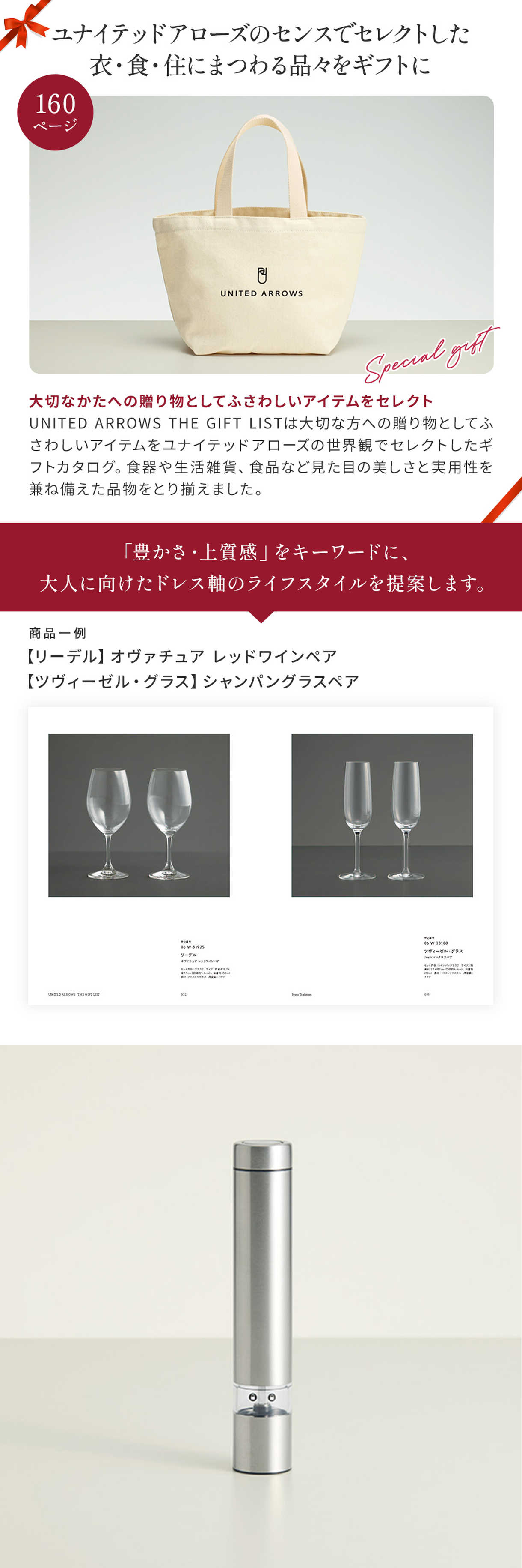 UNITED ARROWS THE GIFT LISTは大切な方への贈り物としてふさわしいアイテムをユナイテッドアローズの世界観でセレクトしたギフトカタログ。食器や生活雑貨、食品など見た目の美しさと実用性を兼ね備えた品物をとり揃えました。