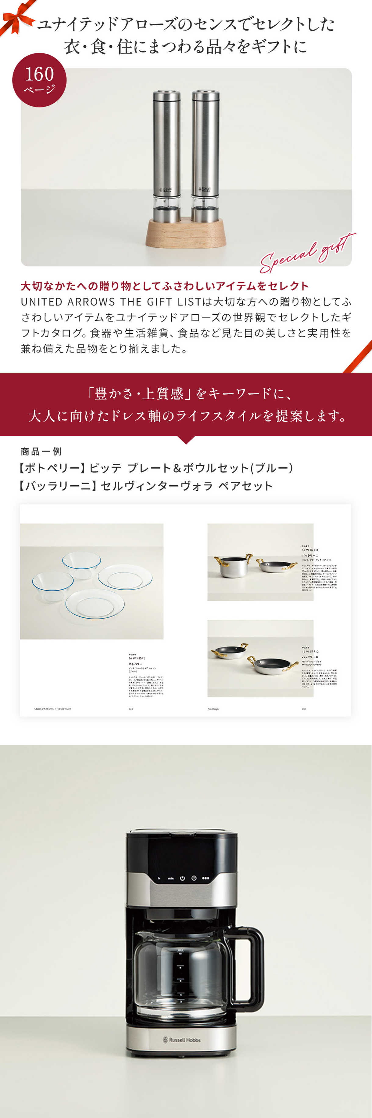 UNITED ARROWS THE GIFT LISTは大切な方への贈り物としてふさわしいアイテムをユナイテッドアローズの世界観でセレクトしたギフトカタログ。食器や生活雑貨、食品など見た目の美しさと実用性を兼ね備えた品物をとり揃えました。